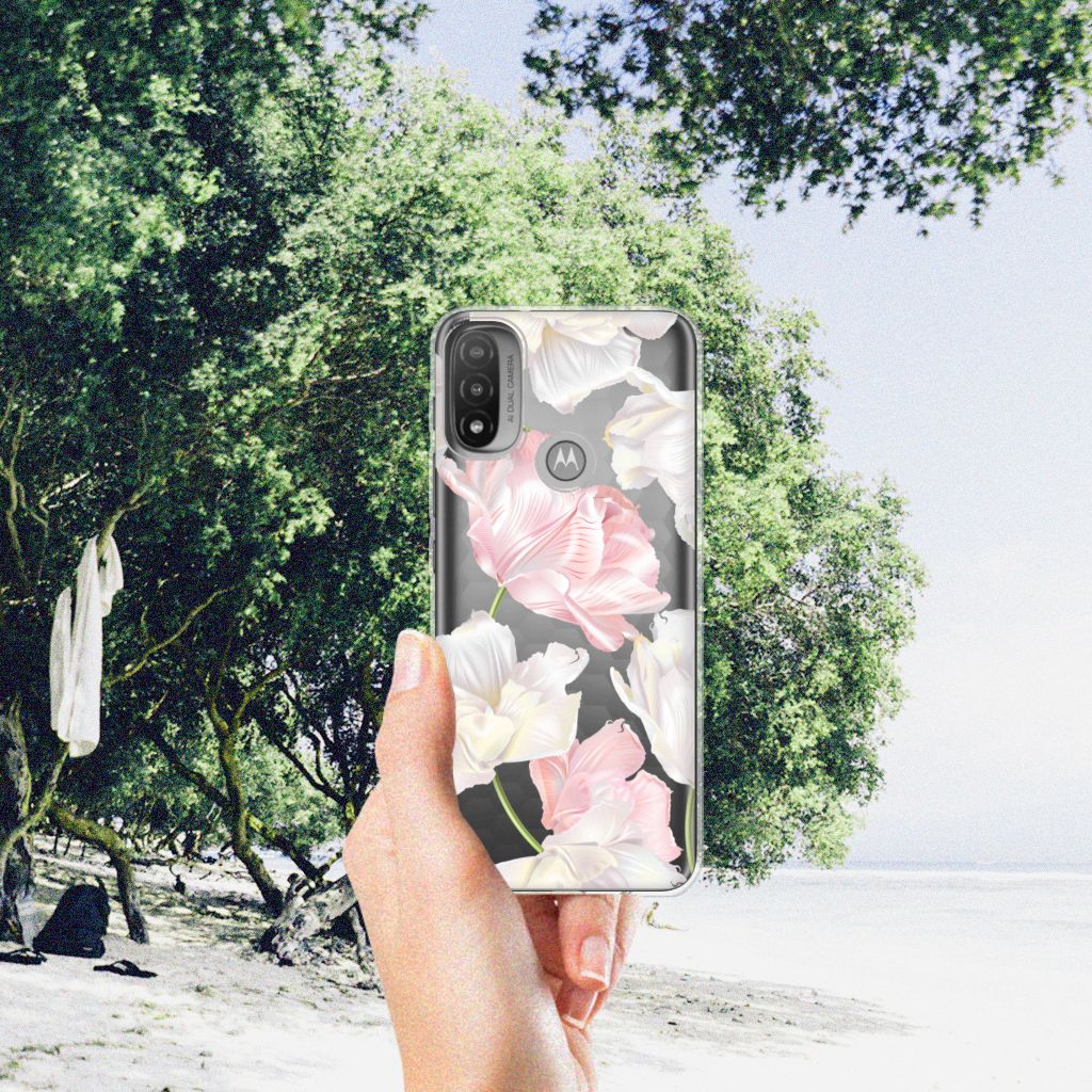 Een bosje bloemen doet een mens (en zijn smartphone) goed. De witte en roze bloemen op deze Motorola Moto E20 | E40 TPU Case geven jouw smartphone een zeer mooie uitstraling. Je wordt er ook meteen een stuk rustiger van als je aan het appen of aan het bellen bent. Valt dan je telefoon op de grond, dan zal er dankzij de tpu case met het design Lovely Flowers ontstaan. Helemaal niet als je er een screenprotector bij hebt gekocht. Onze tpu cases met roze en witte bloemen zien er zeer prettig uit en zijn heel praktisch, getuige onder meer de opstaande randen en het flexibele materiaal. Alleen de achterkant van de tpu case wordt bedrukt met roze en witte bloemen. Op deze tpu case kun je trouwens ook een eigen ontwerp zetten. In een paar simpele stappen ontwerp je zelf een stand case met daarop jouw favoriete bloemen.