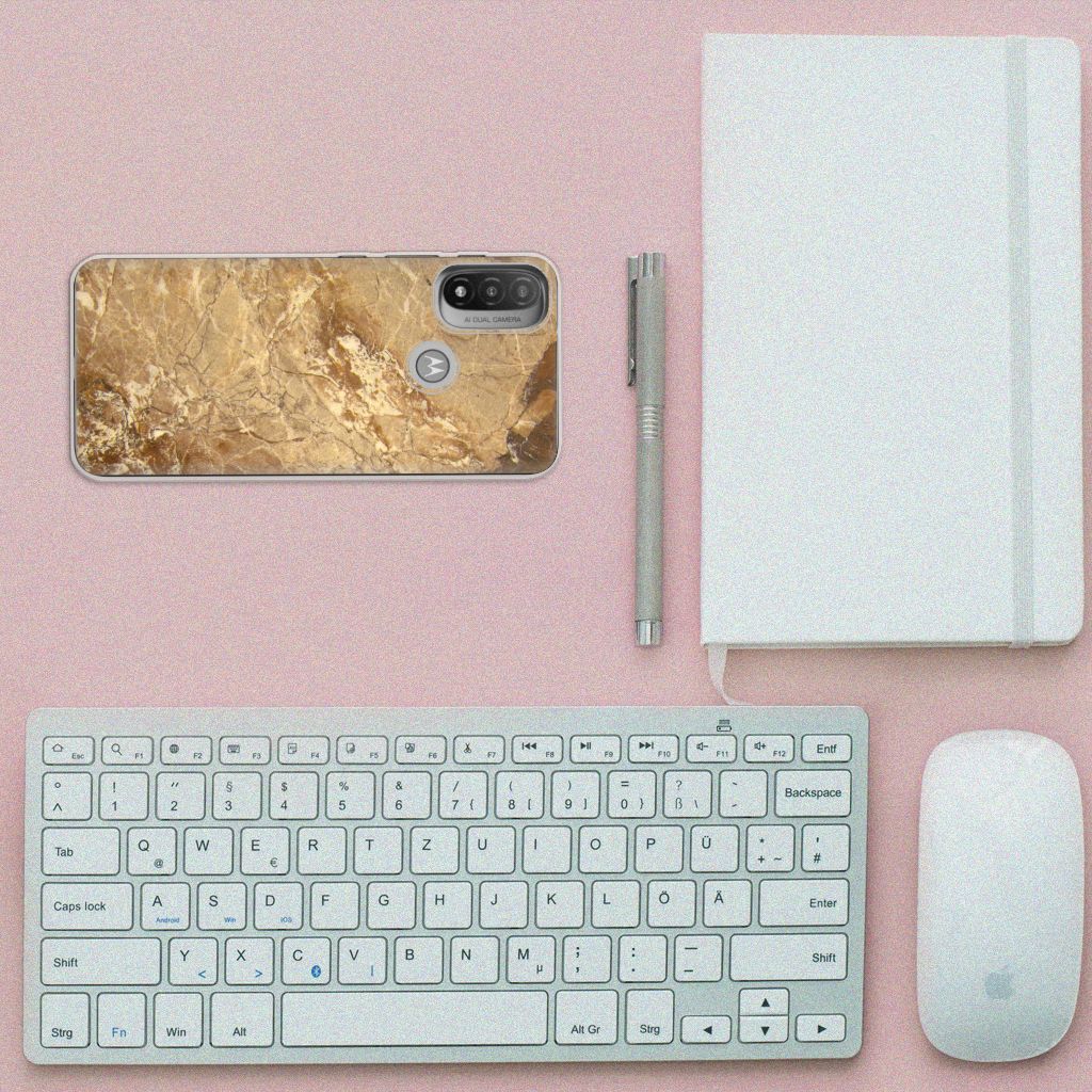 Dit design hoesje met Marmer in lichtbruine kleur is voor de artistiekelingen onder ons. De Grieken en Romeinen wisten het marmer al te waarderen door het in de bouw toe te passen. Naast het witte marmer zijn de diverse soorten marmer in een gevarieerde kleurensamenstelling te krijgen. We hebben verschillende mooie kleuren op design hoesjes gezet, zoals in dit geval het lichtbruine marmer. Dit is een Motorola Moto E20 | E40 TPU Siliconen Hoesje met marmer in lichtbruine kleur. Het marmer wordt bedrukt op de voorkant van een tpu case, die beschikt over opstaande randen aan de voorkant en heel goed combineert met een screenprotector van glas of van folie. Door de rijkdom aan kleuren en varianties in afwerking kunnen ontwerpers met marmer schitterende architectonische projecten realiseren. Wij hebben hetzelfde gedaan en onze ontwerper veel vrijheid geboden. Het resultaat zie je terug in deze tpu case met lichtbruin marmer, die jouw smartphone goed beschermt. De zijkanten van de case worden niet bedrukt met het lichtbruine marmer.