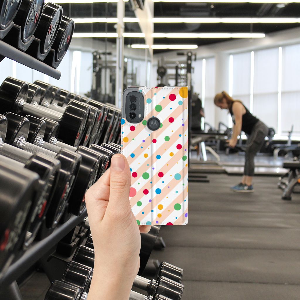 Een Motorola Moto E20 Hoesje met Magneet met verschillende kleuren stippen is een schitterende bescherming van jouw smartphone. De stand case met het design Dots in alle kleuren van de regenboog komt voor jou als geroepen. Maak je geen gebruik van dit zeer mooie hoesje, dan kan het met jouw smartphone een beetje beroerd aflopen. Dit mooie stand hoesje met verschillende kleuren stippen zorgt voor een volledige bescherming van je smartphone en wordt aan alle zijden bedrukt. Dankzij de speciale standaard kun je rustig achteroverleunend filmpjes bekijken terwijl je je handen vrij hebt. Verder is de houder aan de binnenzijde van TPU. Jouw telefoon is dus zeer goed opgeborgen en kan geen kant op. Met een hoesje met stippen in verschillende kleuren op alle zijden blijft jouw telefoon volledig in tact. Heb je liever een stand case met stippen in andere opvallende kleuren? Ontwerp dan zelf case met je eigen foto’s en teksten!