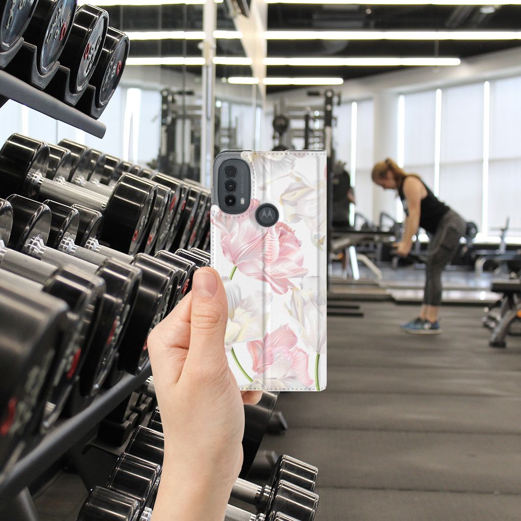 Een bosje bloemen doet een mens (en zijn smartphone) goed. De witte en roze bloemen op dit Motorola Moto E20 Smart Cover geven jouw smartphone een zeer mooie uitstraling. Je wordt er ook meteen een stuk rustiger van als je aan het appen of aan het bellen bent. Valt dan je telefoon op de grond, dan zal er dankzij de stand case met het design Lovely Flowers ontstaan. Onze stand cases met roze en witte bloemen zien er zeer prettig uit en zijn heel praktisch, wat blijkt uit onder meer het vakje aan de binnenkant en de handige standaard waarmee je de smartphone rechtop op tafel neer kunt zetten. De roze en witte bloemen passen goed op alle zijden van de case. Op deze stand case van leer en TPU (houder aan de binnenkant) kun je trouwens ook je eigen bloemige ontwerp zetten. In een paar simpele stappen maak je zelf een stand hoesje met daarop jouw mooiste bloemen.