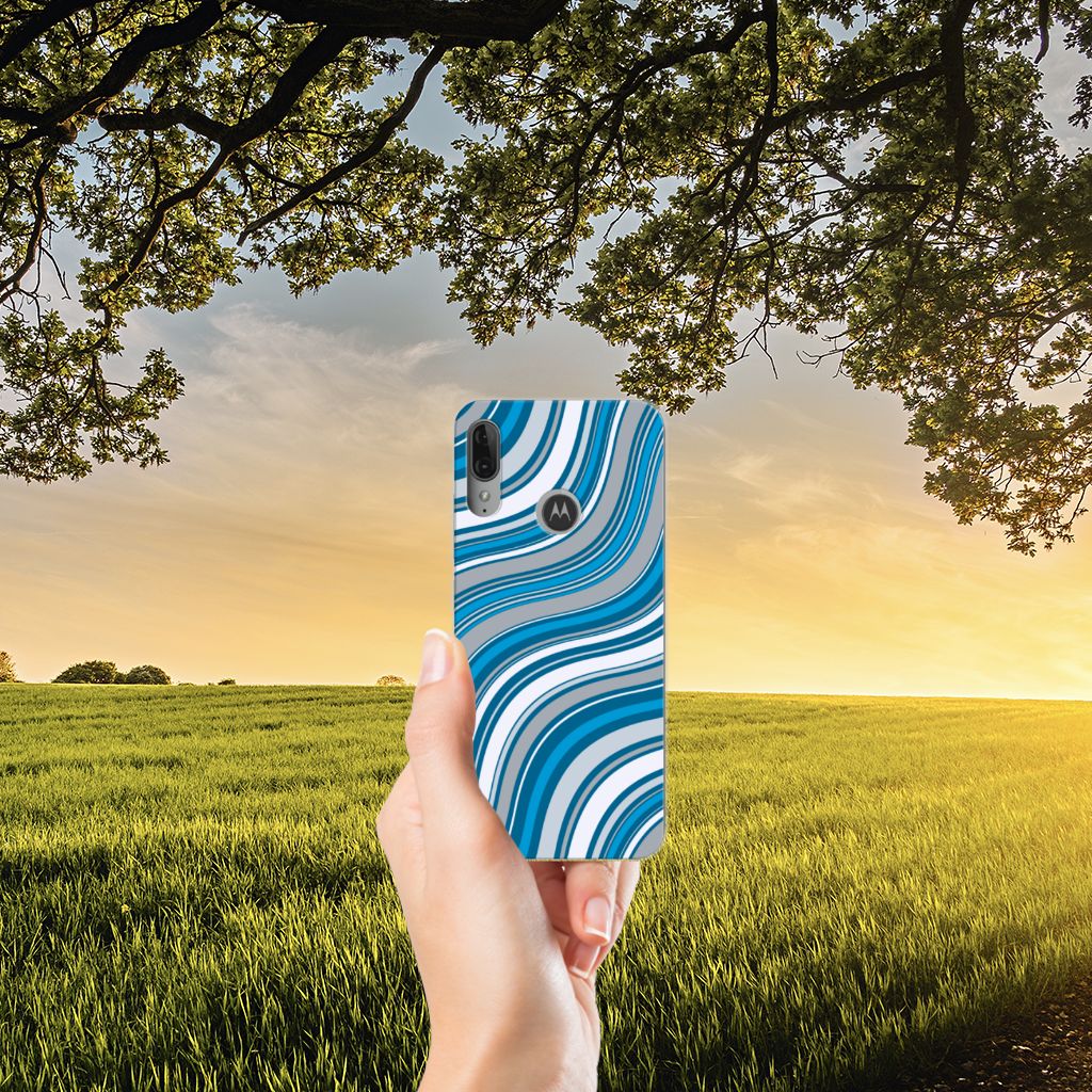 Zeer cool, dit hoesje met vooral blauwe kleuren, die in een golvende beweging jouw telefoon van een mooie uitstraling voorzien. Tijdens een zonnige vakantie aan zee is jouw smartphone perfect beschermd met dit telefoonhoesje. Het design Waves Blue van dit smartphone hoesje doet lichtjes denken aan een lolly, waarmee je een klein kind zeer blij maakt. Jouw Motorola Moto E6 Plus zal er ook zeer vrolijk uitzien samen met dit design hoesje. De witte en grijze kleuren staan in mooi contrast met het blauw, waardoor de uitstraling van deze accessoire zeer mooi is. Ook voor andere kleuren kun je natuurlijk uitstekend terecht in ons assortiment. Het design staat op een TPU bumper. Dit hoesje wordt alleen aan de bovenkant bedrukt en is zeer flexibel. De randen van het hoesje blijven transparant.