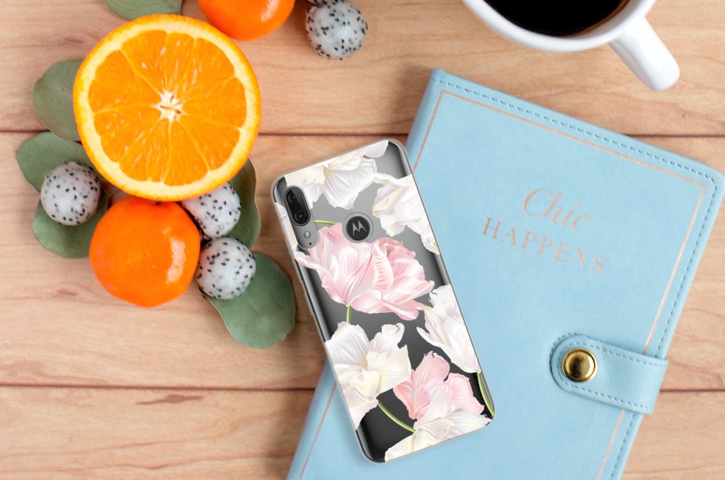 Een bosje bloemen doet een mens (en zijn smartphone) goed. De witte en roze bloemen op deze Motorola Moto E6 Plus TPU Case geven jouw smartphone een zeer mooie uitstraling. Je wordt er ook meteen een stuk rustiger van als je aan het appen of aan het bellen bent. Valt dan je telefoon op de grond, dan zal er dankzij de tpu case met het design Lovely Flowers ontstaan. Helemaal niet als je er een screenprotector bij hebt gekocht. Onze tpu cases met roze en witte bloemen zien er zeer prettig uit en zijn heel praktisch, getuige onder meer de opstaande randen en het flexibele materiaal. Alleen de achterkant van de tpu case wordt bedrukt met roze en witte bloemen. Op deze tpu case kun je trouwens ook een eigen ontwerp zetten. In een paar simpele stappen ontwerp je zelf een stand case met daarop jouw favoriete bloemen.