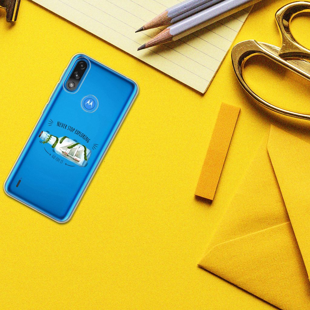 Dit leuke design met een schip in een fles is voor de echte avonturier of reiziger. Dankzij de tekst ‘Never stop exploring: Go for it’ word je altijd herinnerd aan het feit dat het volgende avontuur weer op de loer ligt! Dit design staat op een Telefoonhoesje met Naam voor je Motorola Moto E7/E7i Power. TPU is flexibel en heel erg sterk. Zo is je telefoon aan de achterkant en de randen heel goed beschermd. De case is aan de bovenkant bedrukt, de randen blijven transparant. Het TPU-hoesje is perfect te combineren met een screenprotector, zo zijn je telefoon en je beeldscherm altijd goed beschermd.