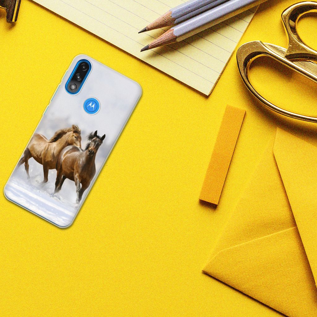 Voor de paardenliefhebbers onder ons hebben we onze collectie uitgebreid met dit design hoesje met print van paarden. Vroeger hield de mens vooral werkpaarden, inmiddels hebben we vriendschap gesloten met het paard. Vandaar dat het ook een favoriet dier is op onze smartphonehoesjes, zoals deze tpu case. Een TPU Hoesje voor de Motorola Moto E7/E7i Power met Paarden is niet alleen super mooi en chique, maar ook nog eens zeer flexibel. Verder is de case schokabsorberend en heeft het opstaande randen. Zie je liever je eigen paard terug op een hoesje. Dat kan! Door zelf een uniek hoesje te ontwerpen, met eigen foto’s en teksten. De TPU case wordt aan de bovenzijde bedrukt, de zijkanten blijven transparant.