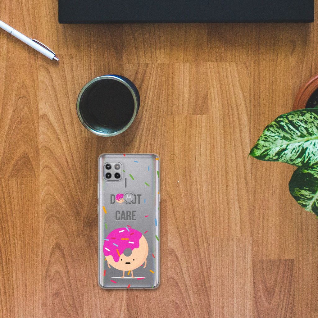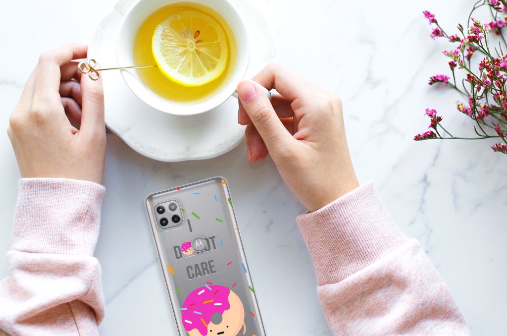 De cartoon met Donut op dit design hoesje geeft jouw smartphone een grappige en vrolijke uitstraling. De Motorola Moto G 5G Siliconen Case zorgt ervoor dat je je schouders op zult halen als je telefoon een keer op de grond valt. Omdat er geen schade zal optreden kun jij je weg weer heel makkelijk vervolgen. De grappige Donut Care tpu case is nergens anders te krijgen. Het design is namelijk van de hand van onze eigen ontwerper. Daarnaast zal de case jouw smartphone goed beschermen. Een Donut Care tpu case is een zeer flexibel hoesje. Dit komt onder andere door het elastische en onbreekbare materiaal. Verder is de case zeer praktisch. Wat denk je bijvoorbeeld van de opstaande randen aan de voorkant. Verder beschikt de case ook nog eens over alle noodzakelijke uitsparingen. Ook kun je zelf je eigen unieke hoesje ontwerpen, met eigen cartoons, foto’s en teksten. Een Donut Care tpu case wordt alleen aan de bovenkant bedrukt. De randen blijven volledig doorzichtig.