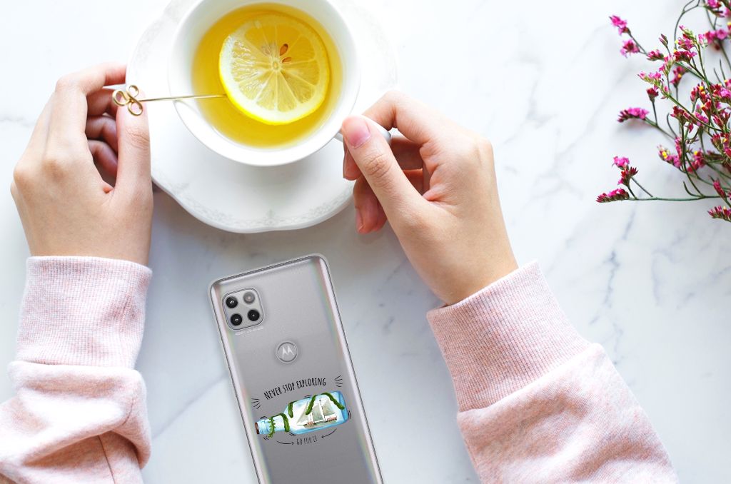 Dit leuke design met een schip in een fles is voor de echte avonturier of reiziger. Dankzij de tekst ‘Never stop exploring: Go for it’ word je altijd herinnerd aan het feit dat het volgende avontuur weer op de loer ligt! Dit design staat op een Telefoonhoesje met Naam voor je Motorola Moto G 5G. TPU is flexibel en heel erg sterk. Zo is je telefoon aan de achterkant en de randen heel goed beschermd. De case is aan de bovenkant bedrukt, de randen blijven transparant. Het TPU-hoesje is perfect te combineren met een screenprotector, zo zijn je telefoon en je beeldscherm altijd goed beschermd.