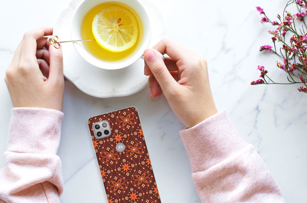Batikken is een super oude kunstvorm. Met deze methode wordt een geweven stof met verf gedecoreerd. Er zijn stoffen gevonden in het Midden-Oosten en Azië van meer dan tweeduizend jaar oud. Wie had kunnen bedenken dat we zo’n mooie batik-print duizenden jaren later zelfs op telefoonhoesjes zouden terugvinden? Dit TPU bumper in voor je Motorola Moto G 5G heeft een prachtig symmetrisch patroon. Door de bruine en oranje kleuren doet het design een beetje retro aan en is het toch subtiel te noemen. Naast het feit dat dit hoesje gewoon erg mooi is, is je telefoon er natuurlijk ook goed mee beschermd. TPU is een zeer sterk maar toch licht en flexibel materiaal en is daarom ideaal voor om je smartphone.