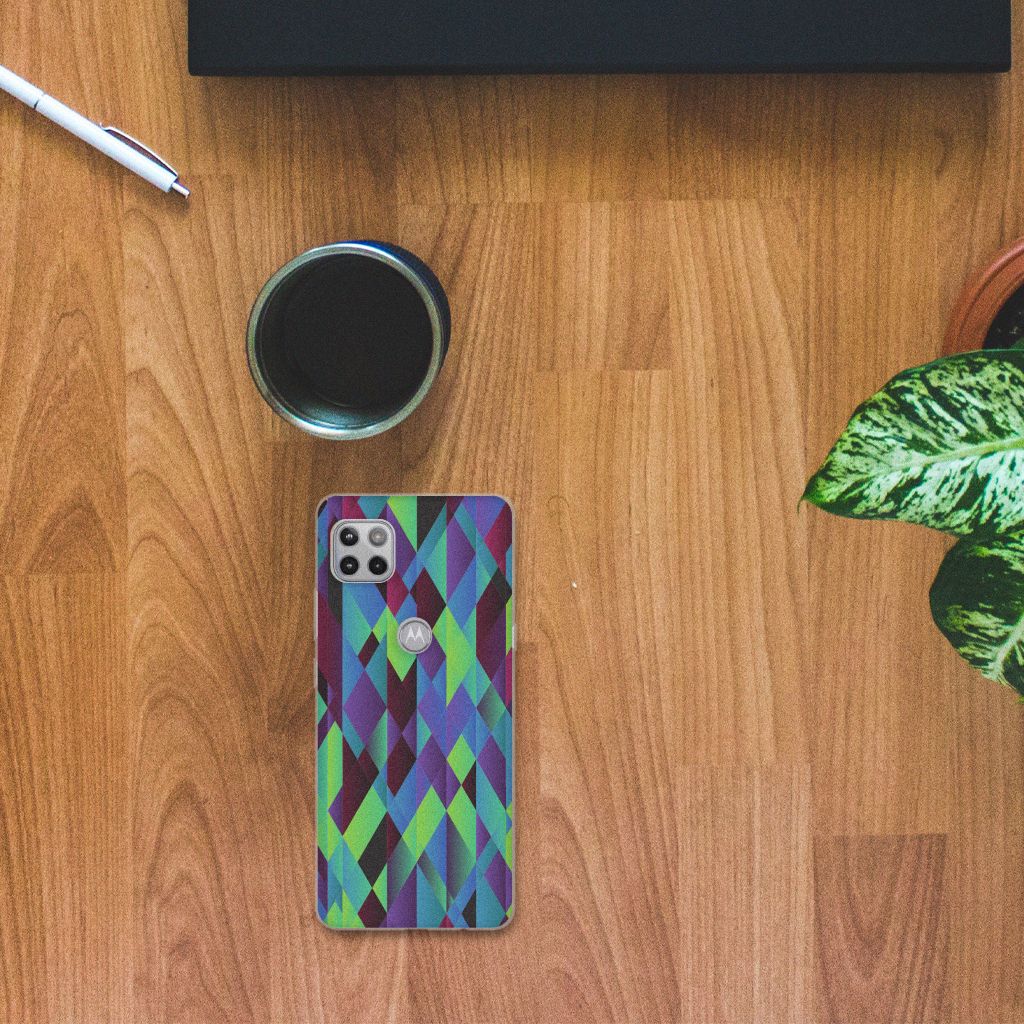 Dit kleurrijke design hoesje is een zeer opvallende bescherming voor jouw smartphone. Mensen zien je van ver aankomen wandelen als je dit hoesje om je telefoon hebt zitten. De case beschikt over ongelooflijk veel kleuren: groen, blauw, paars, blauw, bruin en ga zo maar door. Ze hebben gemeenschappelijk dat ze allemaal zeer fel zijn en op een zeer kunstzinnige manier door elkaar zijn gebruikt. Jouw Motorola Moto G 5G krijgt zeker kleur als je dit hoesje koopt. Het ziet er zeer hip en trendy uit. Zeker een case waar met bewondering naar gekeken zal worden. Het design Abstract Green Blue staat op een TPU case. Dit TPU Hoesje wordt alleen aan de bovenkant bedrukt en is zeer flexibel. De randen van het hoesje blijven transparant.