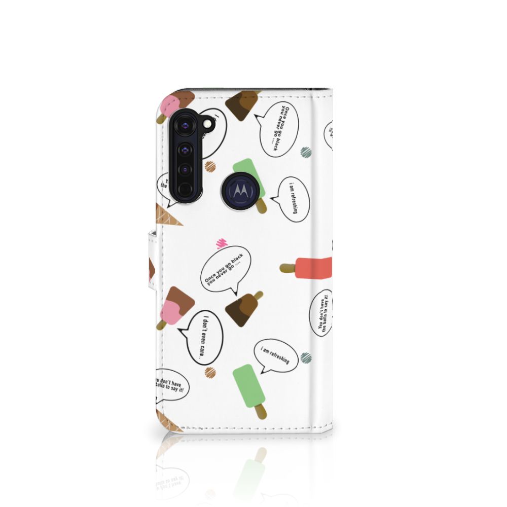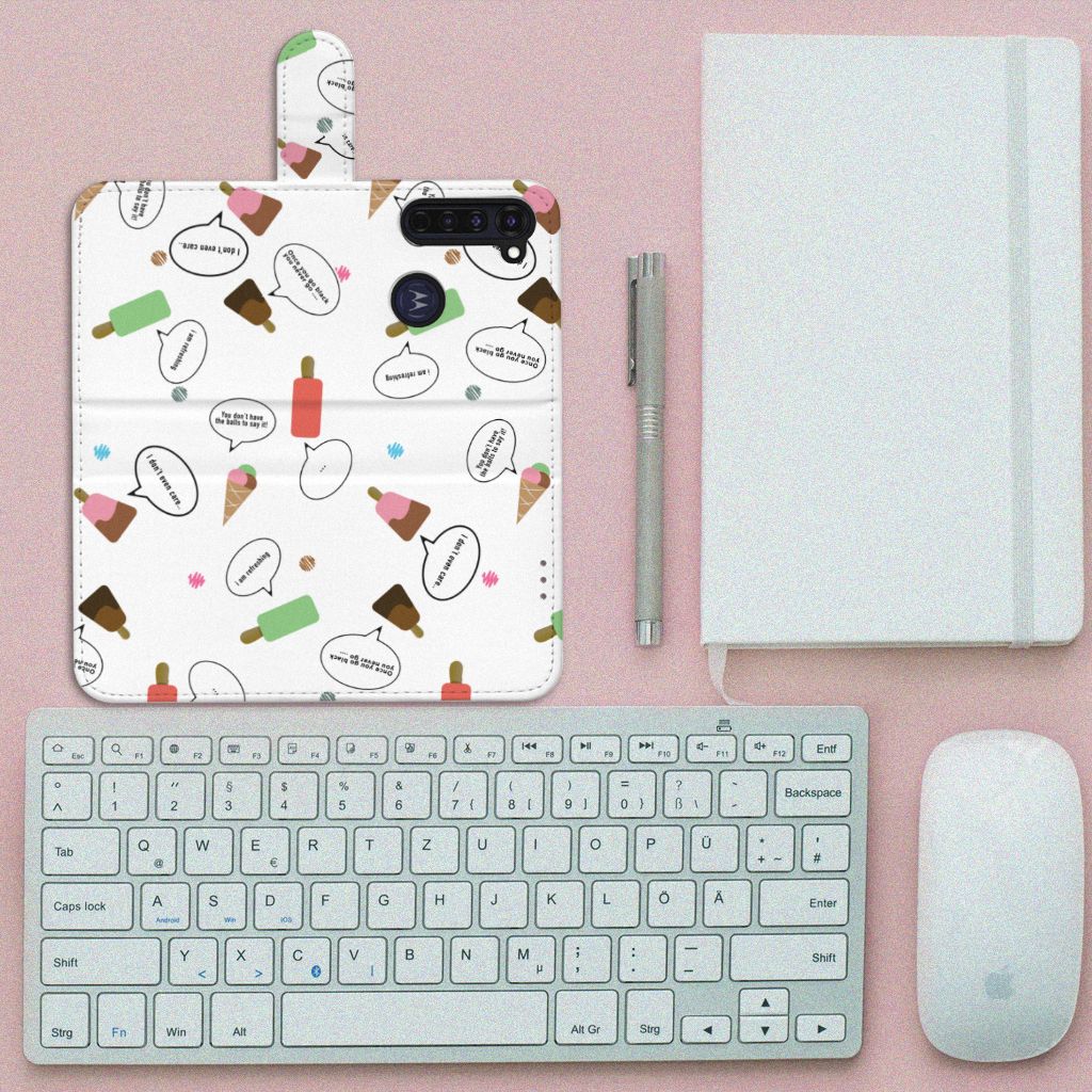 Van dit vrolijke Motorola Moto G Pro Book Cover met daarop verschillende soorten ijsjes met tekstwolkjes krijg je sowieso een vrij en zomers gevoel. De zomer komt naar je toe met deze print van ijsjes met tekstwolkjes. Ben je op het strand, dan ontbreekt een lekker ijsje natuurlijk niet. Net zoals je je smartphone bij de hand hebt, met daaromheen een design hoesje met bijzondere ijsjes en tekstwolkjes. Jouw telefoon kan dan de bescherming in de vorm van een boekhoesje met ijsjes zeer goed gebruiken. Alle zijden van dit hoesje worden bedrukt met ijsjes en tekstwolkjes. De case heeft een lipje aan de buitenzijde voor het afsluiten van de telefoon en de houder aan de binnenzijde is van TPU. Onder alle weersomstandigheden zal deze case met verschillende opbergvakjes perfect functioneren, ook op het strand met een ijsje in je hand.