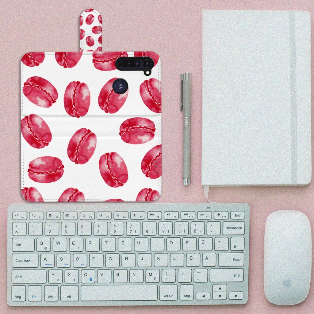 Dit hoesje met Pink Macarons is een zeer opvallende bescherming voor jouw smartphone. Macarons zijn Franse koekjes: kleine, rond en luchtig. Ze worden in veel verschillende smaken gemaakt, herkenbaar aan de verschillende kleuren zoals chocolade (donkerbruin), mokka (middenbruin), kersen (rood), pistache (groen), aardbei (roze), framboos (karmijn). Deze kleuren kun je niet allemaal zien op dit fraaie design hoesje met roze macarons. Heb je altijd al een Motorola Moto G Pro Book Cover willen hebben met roze macarons? Grijp dan nu je kans. Een boekhoesje heeft zeer veel goede eigenschappen, zoals opbergvakjes aan de binnenkant en een magnetische sluiting in de vorm van een lipje aan de buitenzijde. Dit design hoesje met roze macarons wordt aan alle zijden bedrukt, zelfs het lipje krijgt een afbeelding van een roze macaron. De houder aan de binnenkant van het hoesje is van TPU.