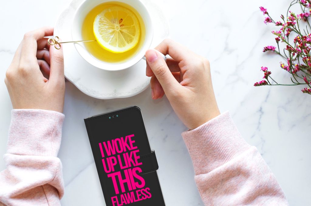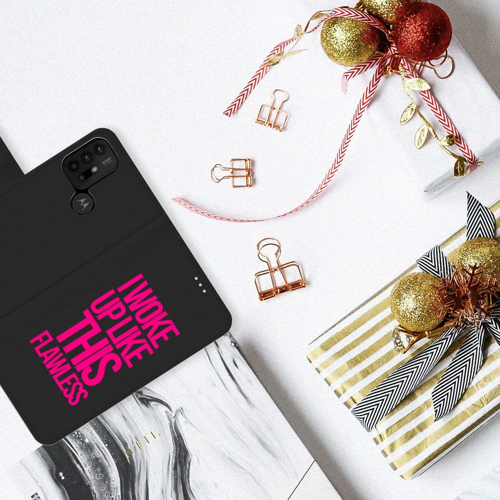Met dit zwarte Motorola Moto G10 | G20 | G30 Hoesje met naam met paarse tekst heb je een geweldige bescherming van je smartphone in handen. Dit zwarte hoesje met Woke Up tekst is een must voor jouw smartphone. Met dit design hoesje tekst val je ook zeker op. Je weet ook zeker dat het hoesje exclusief is. Het design is gemaakt door B2C Telecom. Het hoesje heeft verschillende vakjes en is aan alle zijden bedrukt. Ook het lipje aan de buitenkant kan worden bedrukt. De houder is van TPU, de buitenzijde van PU-leer. We willen je er ook op wijzen dat je zelf een hoesje kunt ontwerpen, met eigen beelden en teksten. Met onze Phone Case Designer kun je zelfs opvallende effecten, patronen en clip arts aan het ontwerp toevoegen.