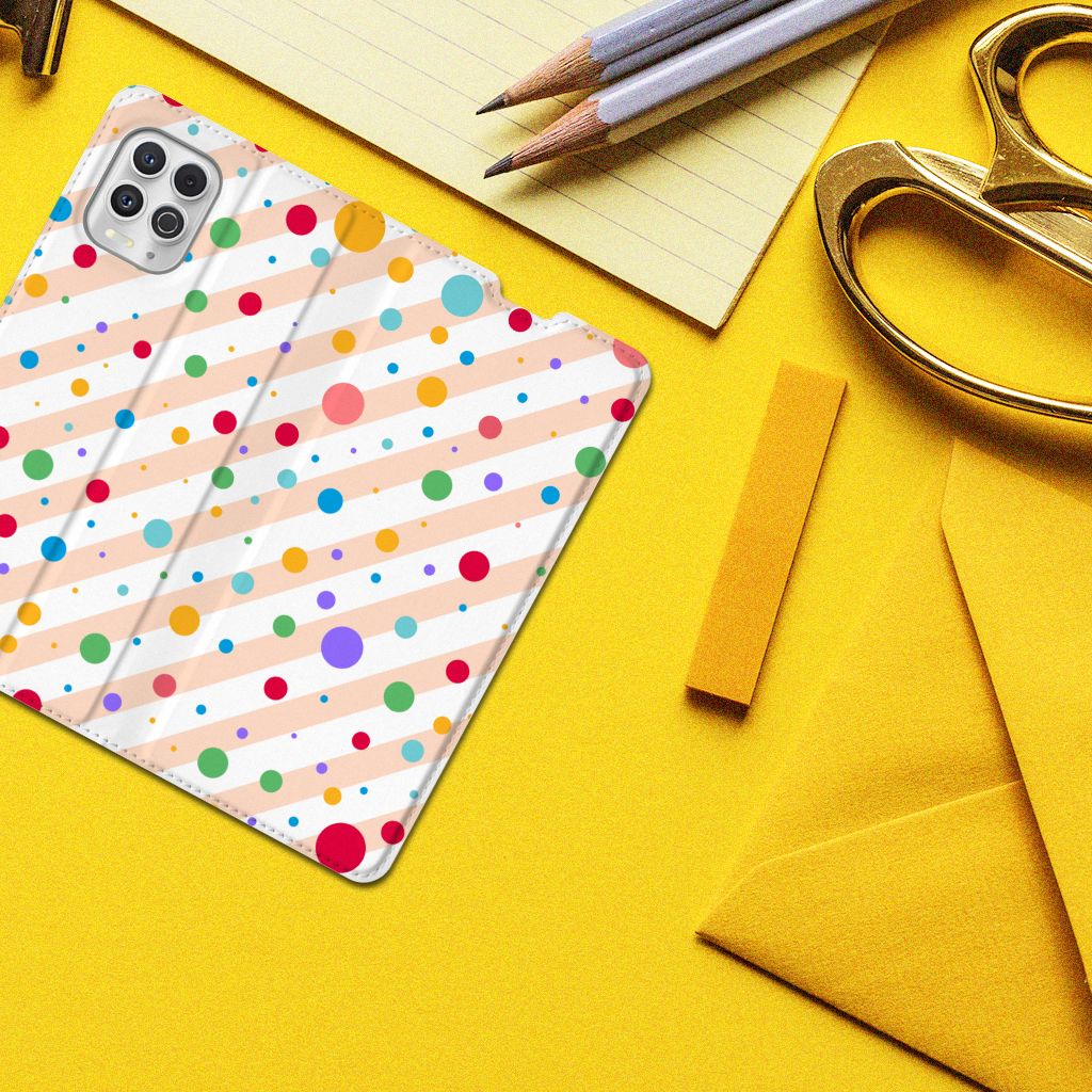 Een Motorola Moto G100 Hoesje met Magneet met verschillende kleuren stippen is een schitterende bescherming van jouw smartphone. De stand case met het design Dots in alle kleuren van de regenboog komt voor jou als geroepen. Maak je geen gebruik van dit zeer mooie hoesje, dan kan het met jouw smartphone een beetje beroerd aflopen. Dit mooie stand hoesje met verschillende kleuren stippen zorgt voor een volledige bescherming van je smartphone en wordt aan alle zijden bedrukt. Dankzij de speciale standaard kun je rustig achteroverleunend filmpjes bekijken terwijl je je handen vrij hebt. Verder is de houder aan de binnenzijde van TPU. Jouw telefoon is dus zeer goed opgeborgen en kan geen kant op. Met een hoesje met stippen in verschillende kleuren op alle zijden blijft jouw telefoon volledig in tact. Heb je liever een stand case met stippen in andere opvallende kleuren? Ontwerp dan zelf case met je eigen foto’s en teksten!