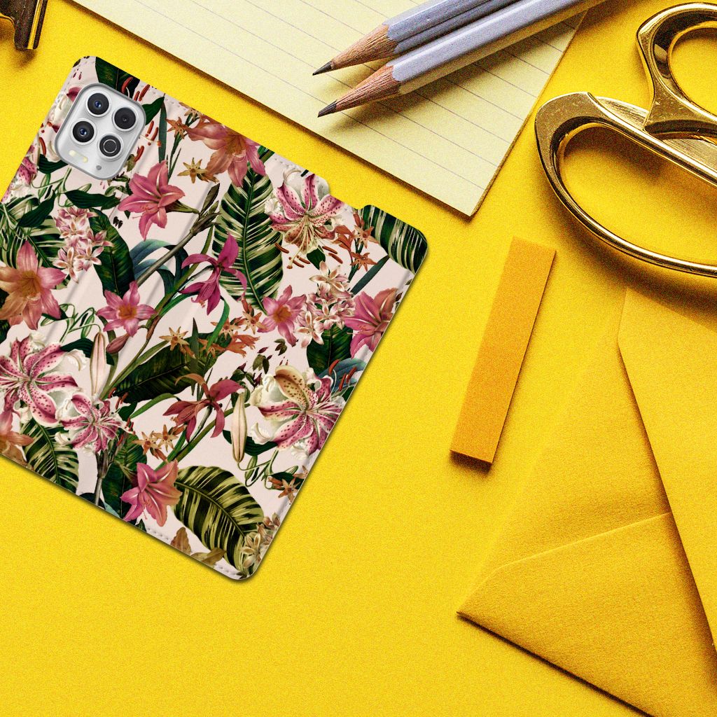 Dit Flowers design is een zegen voor de mens en zijn smartphone. De paarswitte bloemen en groene bladeren op deze Motorola Moto G100 Smart Cover geven jouw smartphone een zeer sierlijke uitstraling. Je krijgt er meteen een goed gevoel bij als je aan het appen, mailen of aan het bellen bent. Valt dan je telefoon op de grond, dan zal er dankzij de stand case met paarswitte bloemen en groene bladeren geen schade ontstaan. Onze stand cases met paarswitte bloemen en groene bladeren bieden de allerbeste bescherming en zijn heel praktisch, wat blijkt uit onder meer het vakje aan de binnenkant en de handige standaard waarmee je de smartphone rechtop op tafel neer kunt zetten. De paarswitte bloemen en groene bladeren komen op alle zijden van de case te staan. Op deze stand case van leer en TPU (houder aan de binnenkant) kun je in no time zelf foto’s van jouw favoriete bloemen zetten.