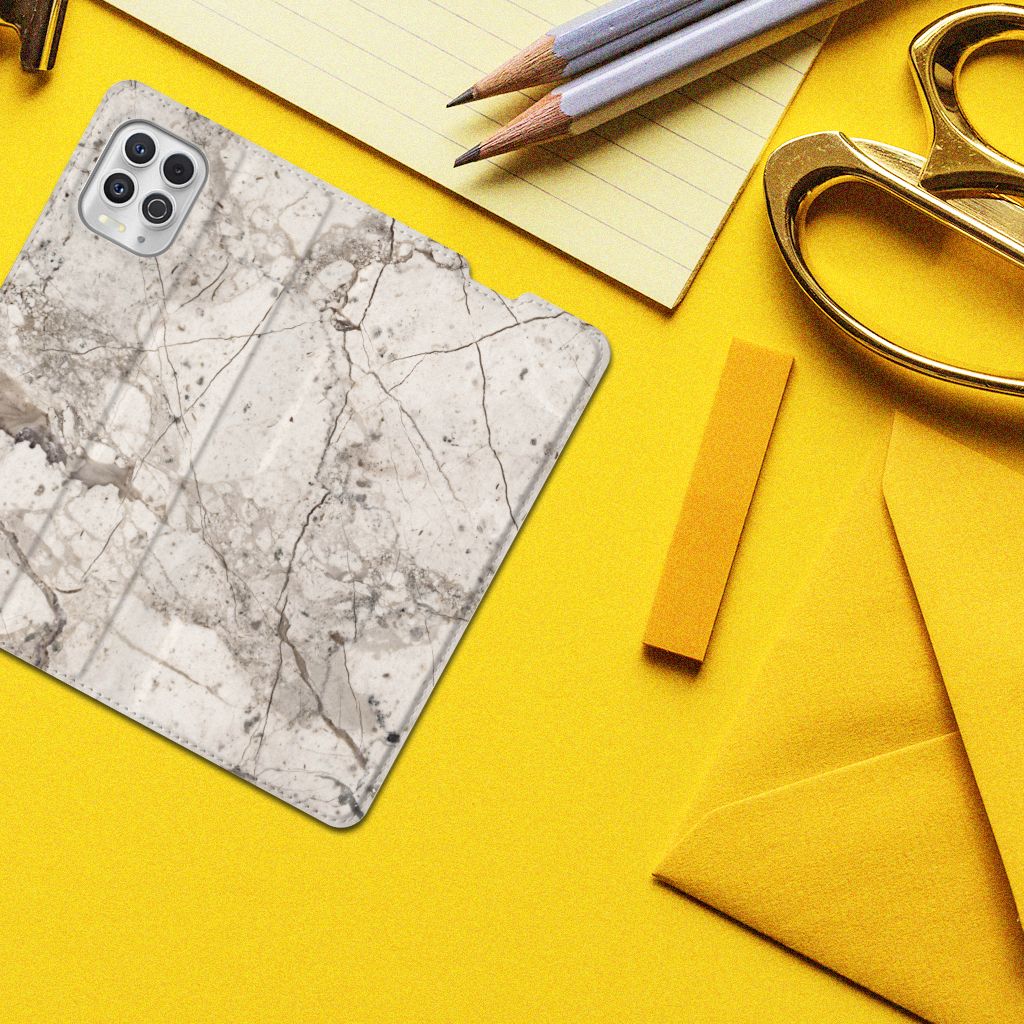 Dit design hoesje met Marmer Beige is voor de artistieke personen onder ons. De Grieken en Romeinen wisten het steen al te waarderen door het als bouw- en bekledingsmateriaal toe te passen. Naast het witte Carrara marmer met haar zacht grijze geaderde belijning zijn de diverse marmersoorten in een ruim kleurenpallet te krijgen. We hebben verschillende kleuren op design hoesjes gezet, zoals in dit geval beige marmer. Dit is een Motorola Moto G100 Standcase met marmer in beige kleur. Het marmer wordt bedrukt op alle zijden van een stand case, die beschikt over 1 vakje voor een pasje en toebehoren en een magnetische sluiting aan de binnenkant. Verder heeft de case een houder van TPU. De rijkheid aan kleuren en varianties in afwerking geeft designers de vrijheid om met marmer hele mooie architectonische projecten te realiseren. Wij hebben onze designer ook veel vrijheid gegeven. Het resultaat zie je terug in deze stand case met beige marmer, dat de ideale bescherming voor jouw smartphone biedt.