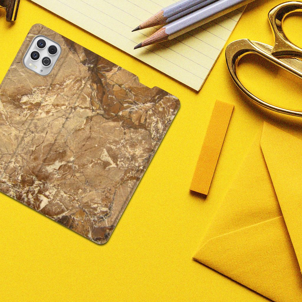Dit design hoesje met Marmer in lichtbruine kleur is voor de artistiekelingen onder ons. De Grieken en Romeinen wisten het marmer al te waarderen door het in de bouw toe te passen. Naast het witte marmer zijn de diverse soorten marmer in een gevarieerde kleurensamenstelling te krijgen. We hebben verschillende mooie kleuren op design hoesjes gezet, zoals in dit geval het lichtbruine marmer. Dit is een Motorola Moto G100 Standcase met marmer in lichtbruine kleur. Het marmer wordt bedrukt op alle zijden van een stand case, die beschikt over 1 vakje voor een pasje en een magnetische sluiting aan de binnenzijde. Verder heeft de hoes een houder van TPU. Door de rijkdom aan kleuren en varianties in afwerking kunnen ontwerpers met marmer schitterende architectonische projecten realiseren. Wij hebben hetzelfde gedaan en onze ontwerper veel vrijheid geboden. Het resultaat zie je terug in deze stand case met lichtbruin marmer, dat de ideale bescherming voor jouw smartphone is.
