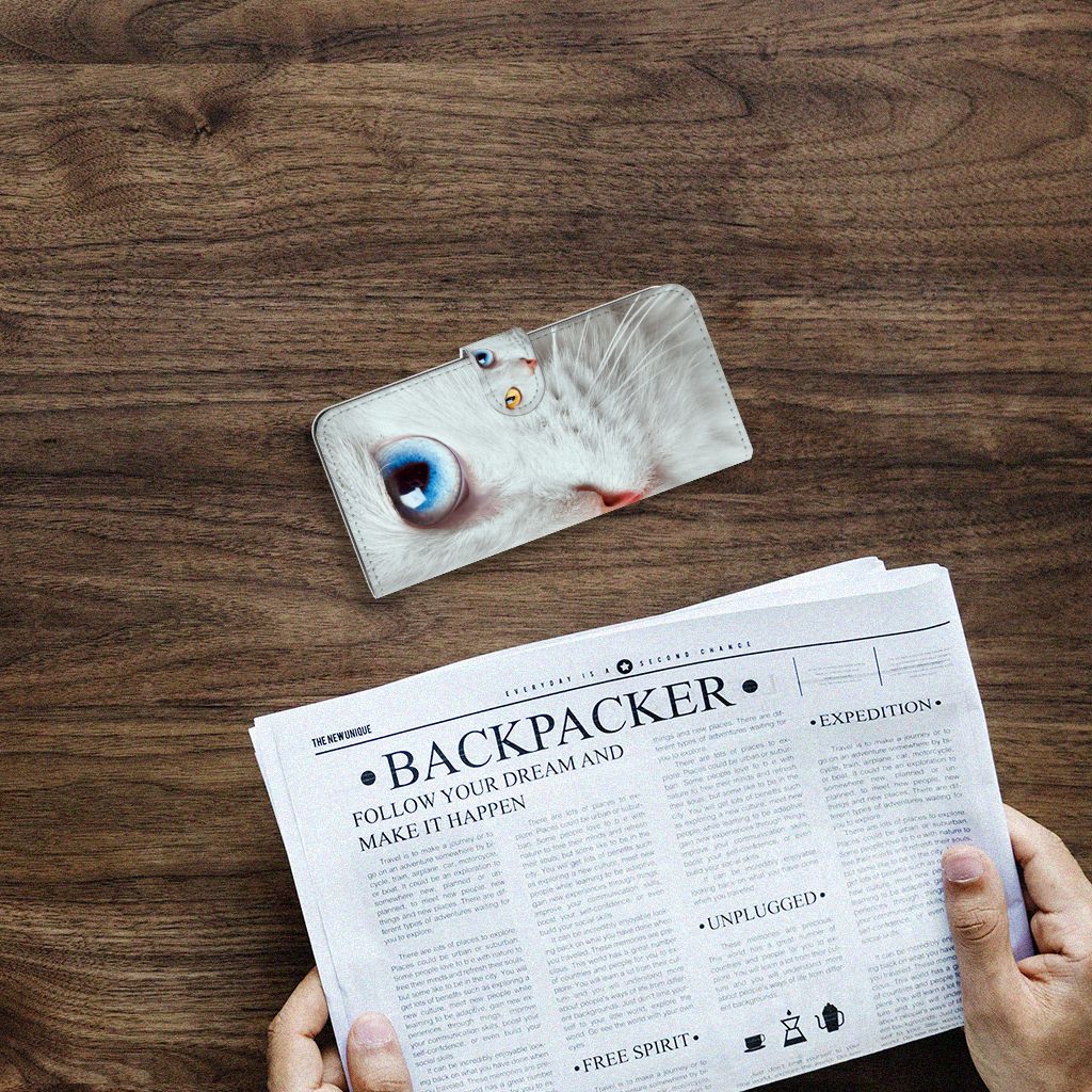 Witte katten zijn erg bijzonder en dat is precies de reden dat wij deze op prominente wijze op dit design hoesje hebben geplaatst. Maar deze witte kat is extra speciaal, doordat de ogen twee verschillende kleuren hebben: blauw en vurig rood. Hiermee heb jij als uniek mens ook een unieke bookcase. Ook de manier waarop dit telefoonhoesje voor de Motorola Moto G100 is bedrukt, is bijzonder. Je ziet namelijk een kleinere versie van dezelfde kat terug op het lipje. Hierdoor zie je de speciale witte kat twee keer terugkomen op jouw hoesje. Omdat je waarschijnlijk een dierenliefhebber bent als je dit Telefoonhoesje met Pasjes uitkiest, is dit ook een erg duurzaam hoesje. Het hoesje wordt aan alle kanten met duurzame inkt bedrukt.