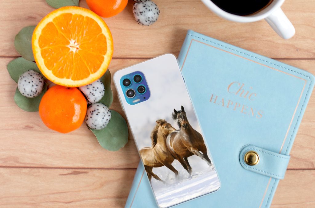 Voor de paardenliefhebbers onder ons hebben we onze collectie uitgebreid met dit design hoesje met print van paarden. Vroeger hield de mens vooral werkpaarden, inmiddels hebben we vriendschap gesloten met het paard. Vandaar dat het ook een favoriet dier is op onze smartphonehoesjes, zoals deze tpu case. Een TPU Hoesje voor de Motorola Moto G100 met Paarden is niet alleen super mooi en chique, maar ook nog eens zeer flexibel. Verder is de case schokabsorberend en heeft het opstaande randen. Zie je liever je eigen paard terug op een hoesje. Dat kan! Door zelf een uniek hoesje te ontwerpen, met eigen foto’s en teksten. De TPU case wordt aan de bovenzijde bedrukt, de zijkanten blijven transparant.