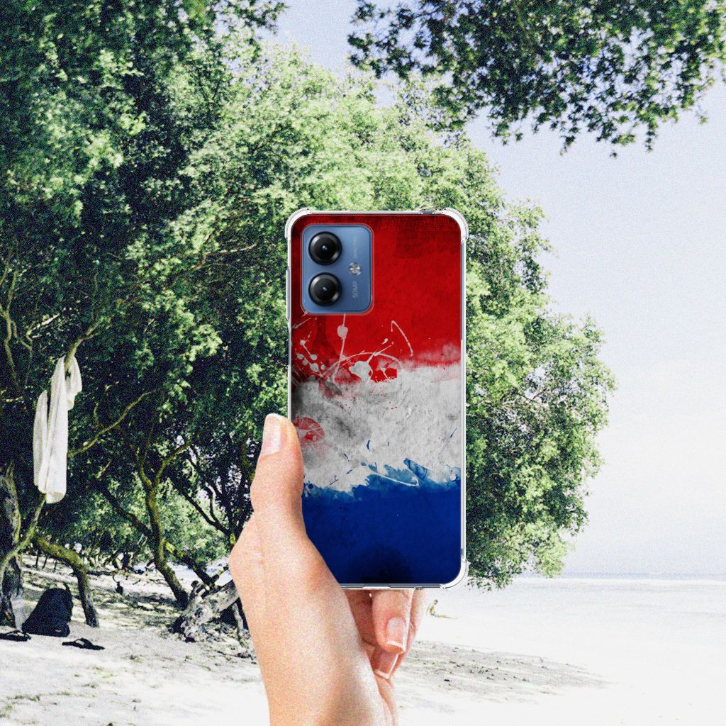 Ben je op zoek naar een uniek telefoonhoesje voor je Motorola Moto G14? Dan ben je bij B2C Telecom aan het juiste adres! Speciaal voor jou hebben we dit prachtige Nederlandse Vlag design in onze collectie hoesjes opgenomen. Het design wordt bedrukt op een Cover Case en is gemaakt van flexibel rubber. Het hoesje is perfect voor de actieve smartphonegebruiker door de opstaande randen/hoeken. Denk aan mensen die veel sporten, reizen of wandelen en net iets meer zekerheid willen als het op hun geliefde telefoon aankomt. Het design wordt alleen aan de bovenkant van het hoesje bedrukt en de randen blijven transparant. Aan de zijkanten zijn uitsparingen gemaakt waardoor je met gemak alle knoppen en poorten kunt bedienen. Wij adviseren om dit hoesje in combinatie met een screenprotector te gebruiken voor een langere levensduur van je telefoon. Wil je dit hoesje nog iets extra's geven? Voeg dan gratis je naam of een quote toe! Is dit design hoesje toch niet helemaal wat je zocht? Ontwerp dan zelf een hoesje in ons ontwerpprogramma.
