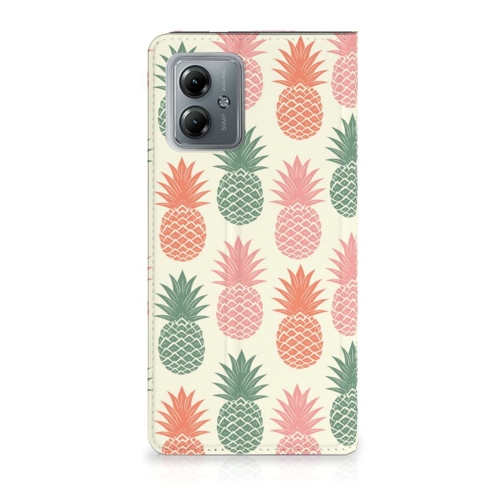 Ananas is een woord uit het Tupi, de taal van de Tupi-indianen, en betekent uitmuntende vrucht. Dit fruit van zeer hoge kwaliteit staat op onze superieure boekhoesjes, stand cases, hard cases en TPU cases. Jij blijft er gezond uitzien als je zo nu en dan een hap neemt van een Ananas , jouw smartphone blijft tip top in orde als je er een leuk telefoonhoesje omheen doet. Een ananas heeft stevig, veerkrachtig vruchtvlees. Een beetje te vergelijken met het TPU in onze hoesjes. TPU is elastisch materiaal, dat zeer buigzaam is. Vandaar dat het zeer schokbestendig is. Het ananas design staat op een stand case. Deze Motorola Moto G14 Flip Style Cover beschermt jouw telefoon aan alle kanten en beschikt over een 1 opbergvakje en een speciale standaard. Het hoesje wordt afgesloten met een magneet aan de binnenzijde. De houder aan de binnenzijde is van TPU.