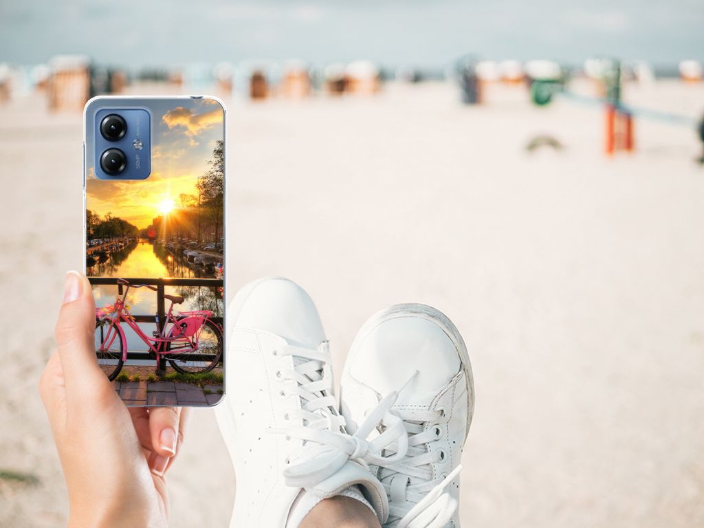 Amsterdam is meer dan ooit een toeristische trekpleister. Een bezoek aan de hoofdstad is niet compleet als je niet aanlegt bij de Amsterdamse Grachten. Ze zijn een symbool van de stad en hebben een enorme culturele en historische waarde. Daarom kunnen ze natuurlijk niet ontbreken in onze collectie design hoesjes. Dit schitterende design hoesje met Amsterdamse grachten tref je enkel en alleen aan bij B2C Telecom. De ondergaande zon en de fleurige en fraaie bloempakketten zorgen voor een prachtig totaalplaatje. Amsterdam is wereldberoemd om haar prachtige grachten uit de zeventiende eeuw. Dit smartphone hoesje is hier een eerbetoon aan. Het design staat op een TPU case. Dit Motorola Moto G14 Siliconen Back Cover wordt alleen aan de bovenkant bedrukt en is zeer flexibel. De randen van het hoesje blijven transparant.