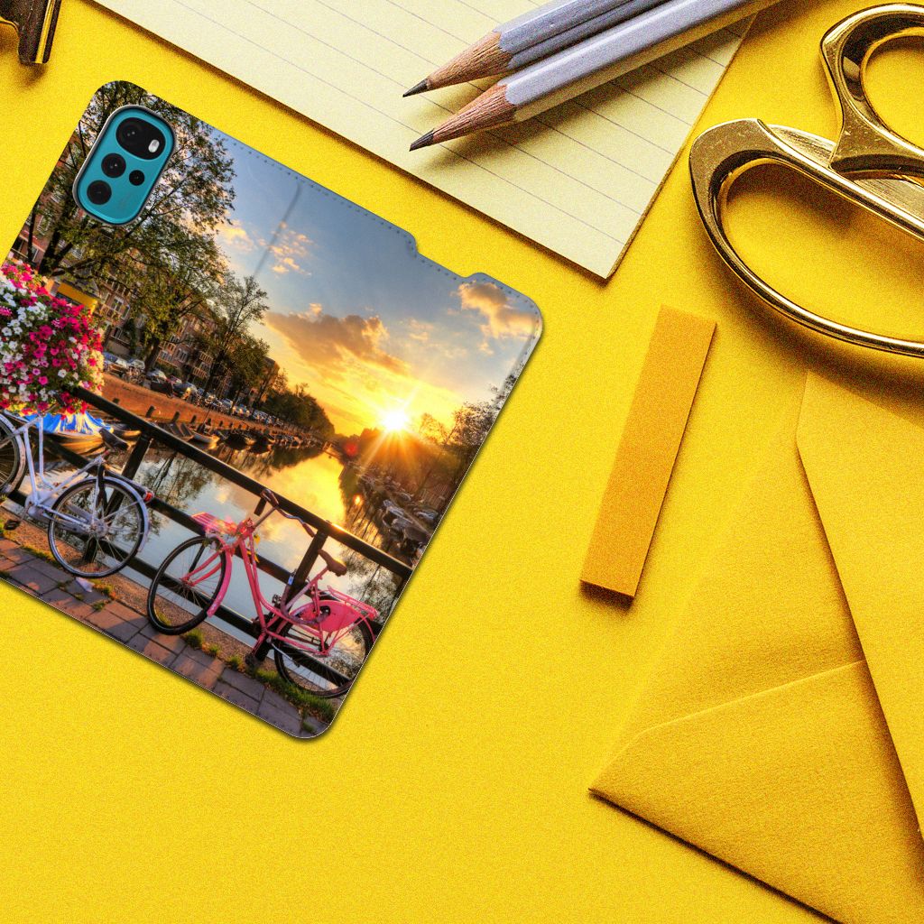 Amsterdam is meer dan ooit een toeristische trekpleister. Een bezoek aan de hoofdstad is niet compleet als er geen bezoek is gebracht aan de Amsterdamse Grachten. Ze zijn een symbool van de stad en hebben een enorme culturele en historische waarde. Daarom kunnen ze natuurlijk niet ontbreken in onze collectie design hoesjes. Dit schitterende design hoesje met Amsterdamse grachten tref je enkel en alleen aan bij B2C Telecom. De ondergaande zon en de fleurige en fraaie bloempakketten zorgen voor een prachtig totaalplaatje. Amsterdam is wereldberoemd om haar prachtige grachten uit de zeventiende eeuw. Dit smartphone hoesje is hier een eerbetoon aan. Het design staat op een stand case. Deze Motorola Moto G22 Book Cover beschermt jouw telefoon aan alle kanten en beschikt over een 1 opbergvakje en een speciale standaard. Het hoesje wordt afgesloten met een magneet aan de binnenzijde. De houder aan de binnenzijde is van TPU. Alle zijden van de stand case worden bedrukt.