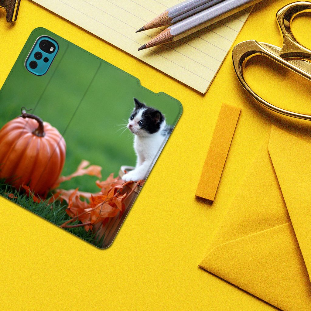 Een huisdier is goed voor je hart: de hoeveelheid stress in je lijf kan aanzienlijk verlagen als je een kat hebt rondlopen. Zelfs het aaien van een kat kan het stressniveau in je lijf al doen verlagen. De kat op dit smartphone hoesje is sowieso zeer aaibaar, gezien de blik en de houding van het dier. De herfstachtige bladeren en de pompoen geven dit stand hoesje met design een natuurlijke uitstraling. Jouw smartphone is met een Motorola Moto G22 Hoesje maken zeer duurzaam te noemen. Er is geen betere bescherming dan dit hoesje, dat ook nog eens 1 opbergvakje heeft en een standaard. Alle zijden van dit hoesje zijn bedrukt. Het hebben van een kat kan verzachtend werken, bijvoorbeeld na een heftige gebeurtenis. Het hoesje is aan de binnenzijde van TPU (houder).