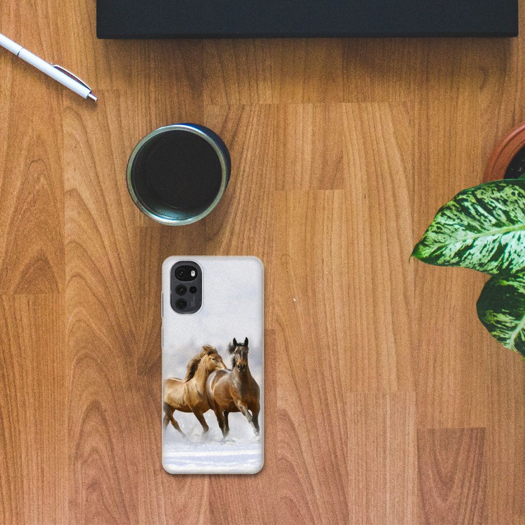 Voor de paardenliefhebbers onder ons hebben we onze collectie uitgebreid met dit design hoesje met print van paarden. Vroeger hield de mens vooral werkpaarden, inmiddels hebben we vriendschap gesloten met het paard. Vandaar dat het ook een favoriet dier is op onze smartphonehoesjes, zoals deze tpu case. Een TPU Hoesje voor de Motorola Moto G22 met Paarden is niet alleen super mooi en chique, maar ook nog eens zeer flexibel. Verder is de case schokabsorberend en heeft het opstaande randen. Zie je liever je eigen paard terug op een hoesje. Dat kan! Door zelf een uniek hoesje te ontwerpen, met eigen foto’s en teksten. De TPU case wordt aan de bovenzijde bedrukt, de zijkanten blijven transparant.