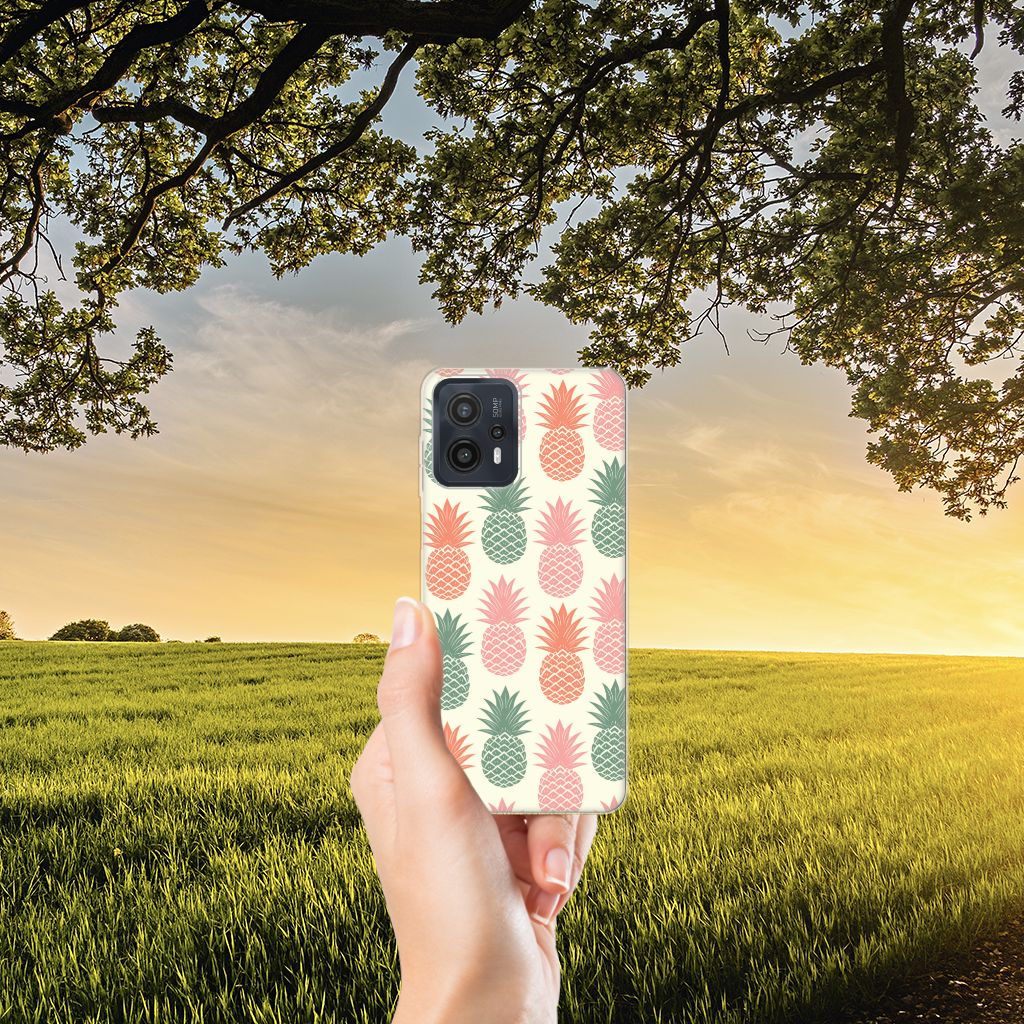 Ananas is een woord uit het Tupi, de taal van de Tupi-indianen, en betekent uitmuntende vrucht. Dit fruit van zeer hoge kwaliteit staat op onze superieure boekhoesjes, stand cases, hard cases en TPU cases. Jij blijft er gezond uitzien als je zo nu en dan een hap neemt van een Ananas , jouw smartphone blijft tip top in orde als je er een leuk telefoonhoesje omheen doet. Een ananas heeft stevig, veerkrachtig vruchtvlees. Een beetje te vergelijken met het TPU in onze hoesjes. TPU is elastisch materiaal, dat zeer buigzaam is. Vandaar dat het zeer schokbestendig is. Het ananas design staat op een staat op een TPU case. Deze Motorola Moto G23 | G13 Siliconen Case wordt alleen aan de bovenkant bedrukt en is zeer flexibel. De randen van het hoesje blijven transparant.