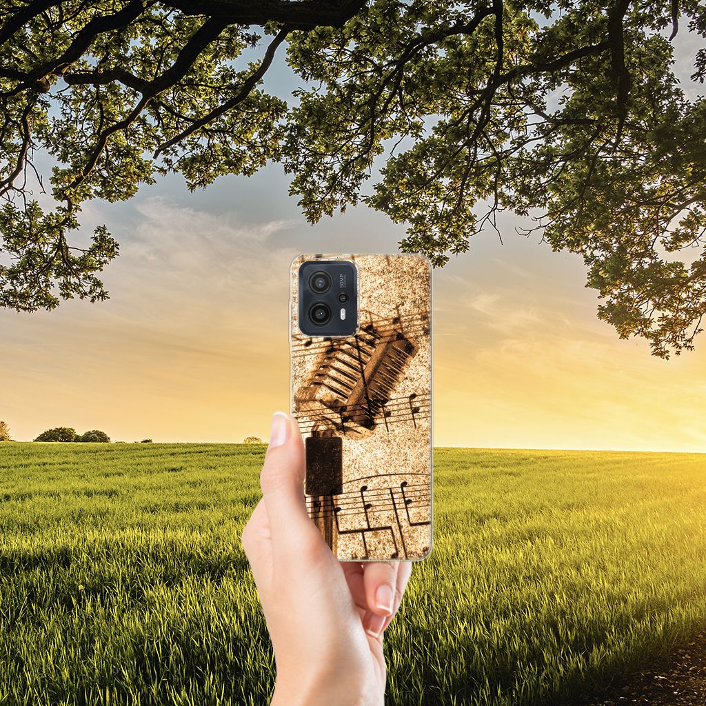 Ben je muzikant, dan is dit design hoesje met Bladmuziek wellicht echt iets voor jou. Met de intrede van nieuwe media wordt de rol van papieren bladmuziek teruggedrongen. Steeds vaker treft men 'bladmuziek' op een beeldschermapparaat, zoals een tablet-pc, e-reader of iPad aan. Gelukkig maar, want als er geen nieuwe media zouden zijn, hadden wij ook nooit onze Phone Case Designer kunnen ontwerpen. Met deze unieke ontwerpmodule kun je jouw favoriete band of artiest op je smartphone hoesje zetten, maar je kunt ook gaan voor dit prachtige design hoesje met print van bladmuziek. Het design staat op een Motorola Moto G23 | G13 Siliconen Hoesje met foto. Deze case beschermt jouw telefoon vooral aan de achterzijde en zijkanten en is zeer flexibel. Het hoesje blijft aan de zijkanten transparant, de bovenkant is geheel bedrukt. TPU is onbreekbaar materiaal, dat zeer schokabsorberend is. Het hoesje past altijd in je broekzak en combineert uitstekend met een screenprotector.