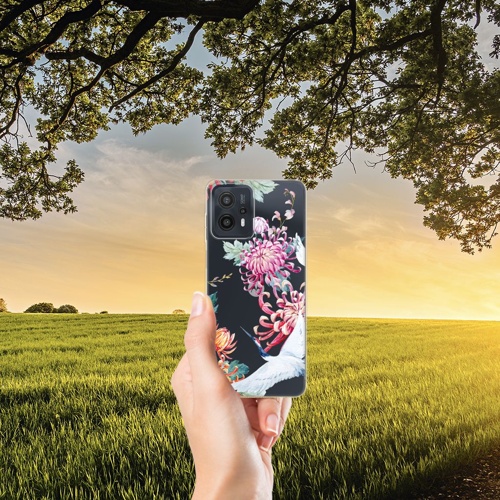 Verspreid over de hele wereld leven 19 soorten ooievaars. De spanwijdte – dat is de afstand van vleugeltip tot vleugeltip – van een volwassen ooievaar kan 2.50 meter bedragen. De gebieden waarin de ooievaar broedt, liggen in heel Europa, het Midden-Oosten, West- en Centraal-Azië en Noordwest-Afrika. Het ideale leefgebied van de ooievaar is een half open tot open landschap met veel afwisseling in grondgebruik en begroeiing. De begroeiing op dit design hoesje, in allerlei verschillende kleuren, zal niet alleen voor de ooievaars fraai zijn. Jij zult er zelf ook heel vrolijk van worden. Het in het oog springende design staat op een TPU Hoesje. Dit telefoonhoesje wordt alleen aan de bovenkant bedrukt en is zeer flexibel. De randen van het hoesje blijven transparant en worden niet bedrukt. Met dit hoesje past jouw Motorola Moto G23 | G13 altijd in je broekzak.