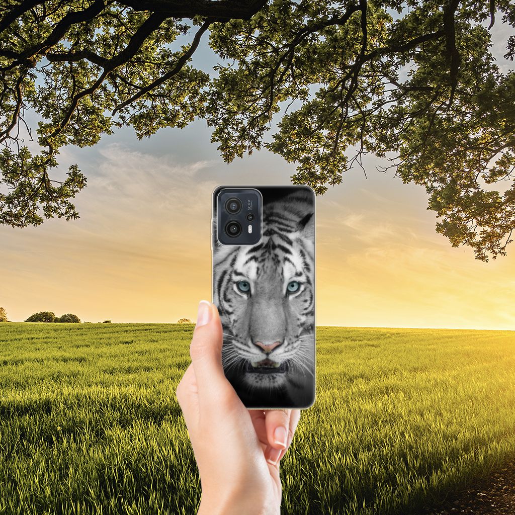 Omdat de Witte Tijger zo bijzonder is, zijn wij bereid deze voor zeer lage kosten op een tpu case te zetten. Dit kunnen we zo goedkoop doen omdat we het drukwerk in eigen beheer doen. Witte tijgers leefden lange tijd in de bossen van India, Bangladesh, Nepal, Bhutan en China en kunnen wel 257 kilo wegen. Dit zwaargewicht kunnen we bedrukken op verschillende soorten hoesjes, zoals deze tpu cases. Deze Motorola Moto G23 | G13 TPU Hoesje kan exclusief in het bezit van jou komen. Zeker als je er zelf nog unieke teksten en/of beelden aan toevoegt. Het tpu hoesje is zeer flexibel en wordt alleen aan de bovenzijde bedrukt. De randen van dit flexibele hoesje blijven doorzichtig. Tegenwoordig zijn witte tijgers alleen in gevangenschap te bewonderen. Jij zorgt voor een goede bescherming van je smartphone met dit design hoesje met witte tijger.