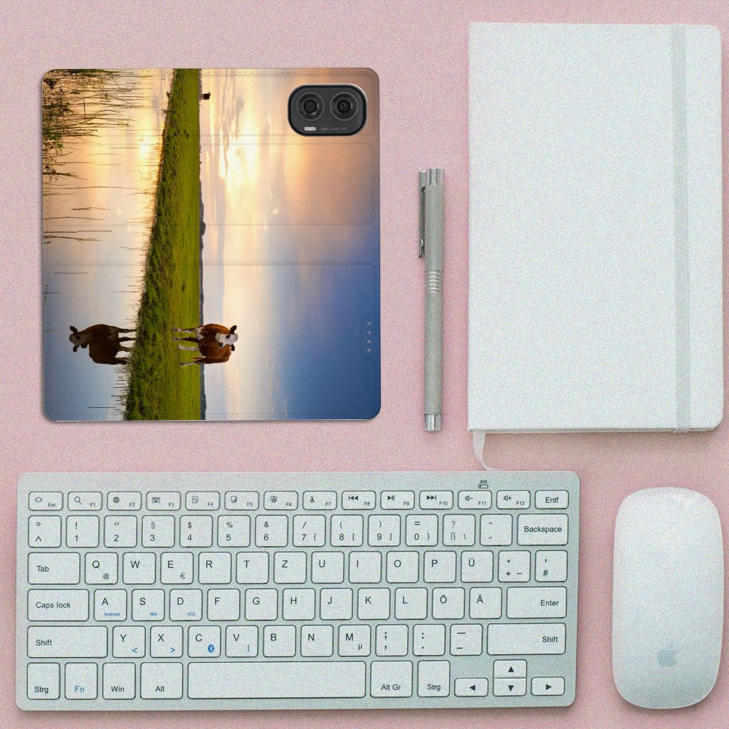 Het levert een idyllisch plaatje op, dit hoesje met een koe en ondergaande zon op de achtergrond. Door een koe buiten te laten lopen en grazen, hebben ze minder kans om ziek te worden. De Koe graast het liefst met soortgenoten, al zijn deze een stukje van de koe op de case verwijderd. Dit levert ook een mooi plaatje op, zoals je kunt zien op dit design hoesje. Deze stand case ziet er strak uit en is voorzien van verschillende uitsparingen. Een Motorola Moto G24 | G04 | G24 Power Hoesje maken met magneet aan de binnenzijde beschermt jouw smartphone overal. Alle zijden zijn bedrukt. Koeien hebben lange graasperioden nodig, afgewisseld door rust- en herkauwperioden. Zo goed als grazen voelt voor koeien, zo lang zal jouw design hoesje meegaan. De binnenkant van de stand case is van TPU, de buitenzijde van leer.