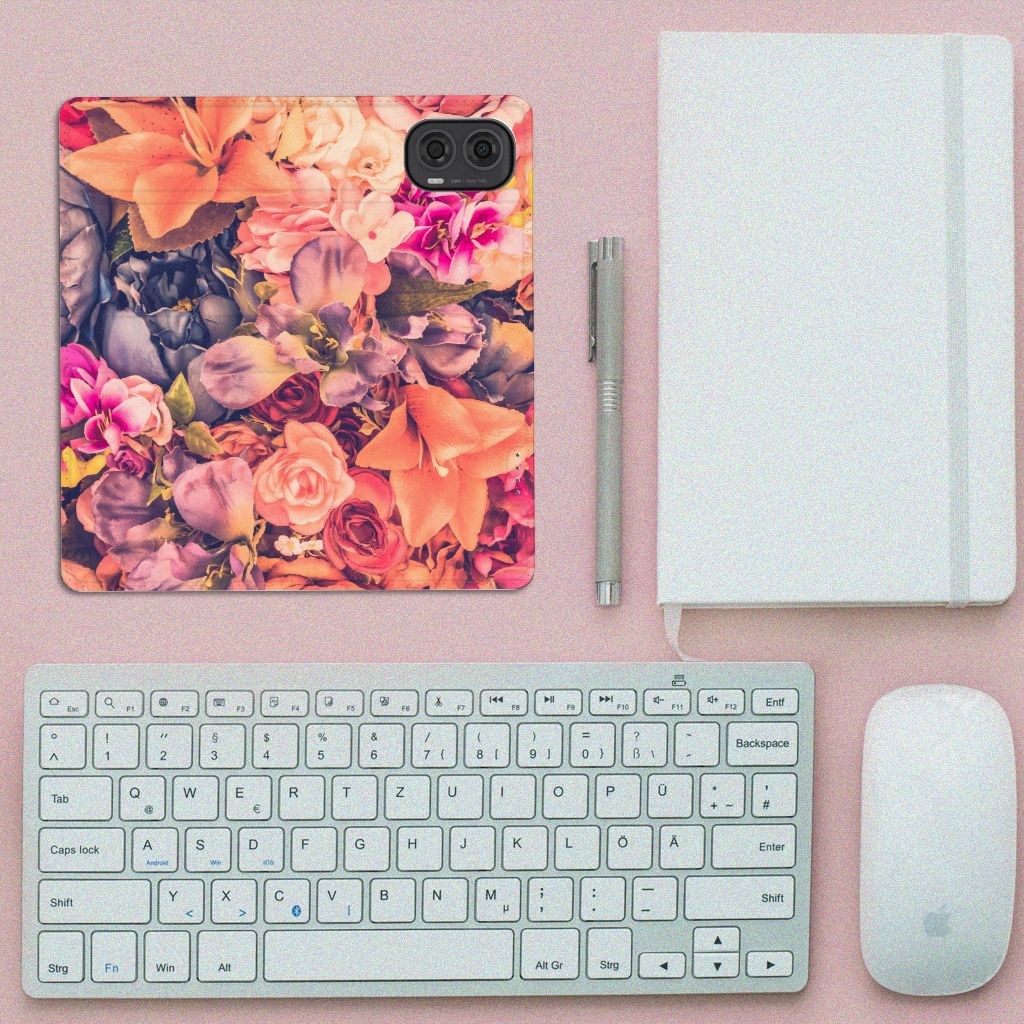 Dit Bosje Bloemen doet een mens en zijn smartphone goed. De oranje, paarse en roze bloemen op deze Motorola Moto G24 | G04 | G24 Power Smart Cover geven jouw smartphone een zeer sierlijke uitstraling. Je wordt er ook meteen vrolijker van als je aan het appen, mailen of aan het bellen bent. Valt dan je telefoon op de grond, dan zal er dankzij de stand case met oranje, paarse en roze bloemen geen schade ontstaan. Onze stand cases met oranje, paarse en roze bloemen bieden de allerbeste bescherming en zijn heel praktisch, wat blijkt uit onder meer het vakje aan de binnenkant en de handige standaard waarmee je de smartphone rechtop op tafel neer kunt zetten. De oranje, paarse en roze bloemen passen goed op alle zijden van de case. Op deze stand case van leer en TPU (houder aan de binnenkant) is het ook mogelijk je eigen ontwerp te zetten. In no time maak je zelf een stand case met daarop foto’s van jouw favoriete bloemen.