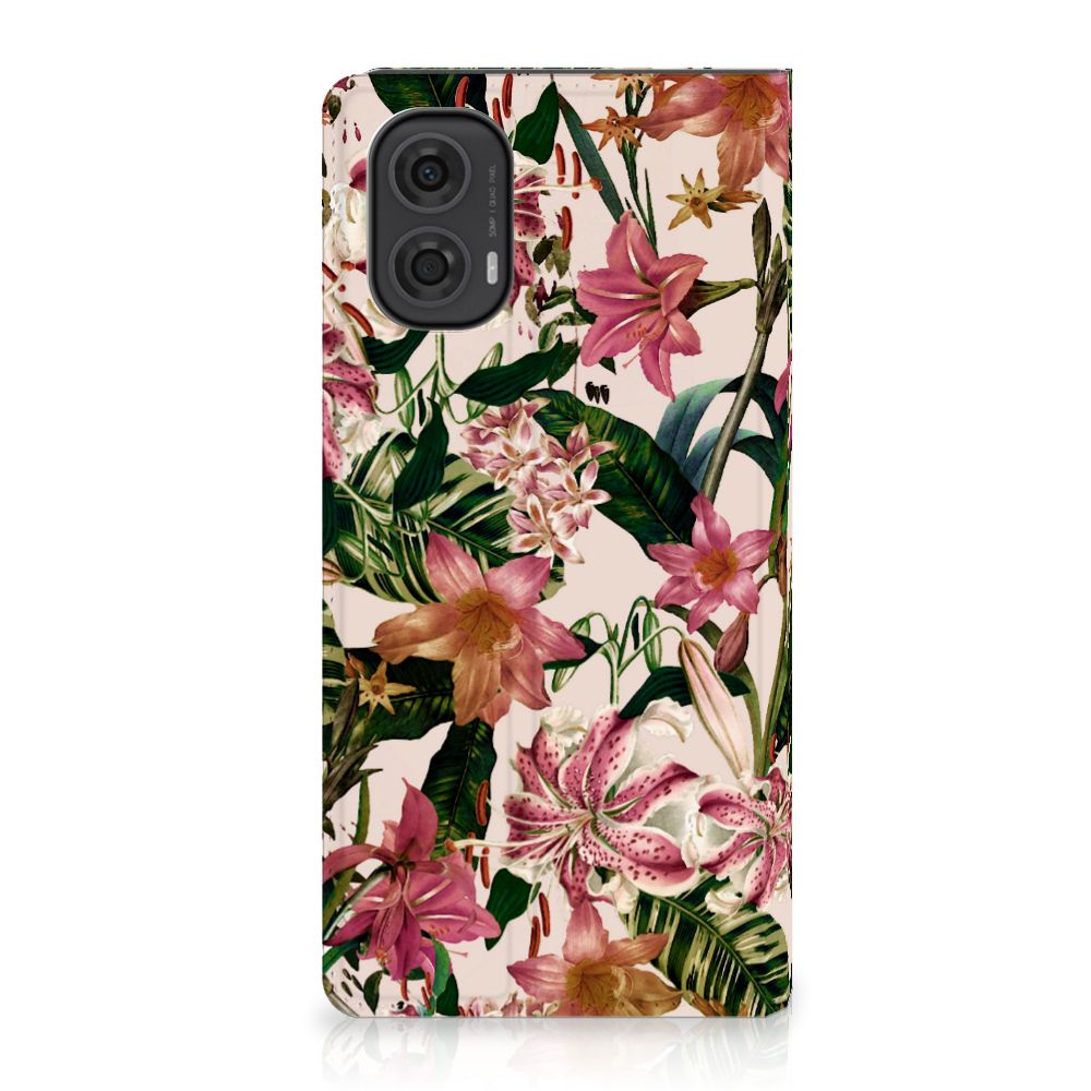 Dit Flowers design is een zegen voor de mens en zijn smartphone. De paarswitte bloemen en groene bladeren op deze Motorola Moto G24 | G04 | G24 Power Smart Cover geven jouw smartphone een zeer sierlijke uitstraling. Je krijgt er meteen een goed gevoel bij als je aan het appen, mailen of aan het bellen bent. Valt dan je telefoon op de grond, dan zal er dankzij de stand case met paarswitte bloemen en groene bladeren geen schade ontstaan. Onze stand cases met paarswitte bloemen en groene bladeren bieden de allerbeste bescherming en zijn heel praktisch, wat blijkt uit onder meer het vakje aan de binnenkant en de handige standaard waarmee je de smartphone rechtop op tafel neer kunt zetten. De paarswitte bloemen en groene bladeren komen op alle zijden van de case te staan. Op deze stand case van leer en TPU (houder aan de binnenkant) kun je in no time zelf foto’s van jouw favoriete bloemen zetten.