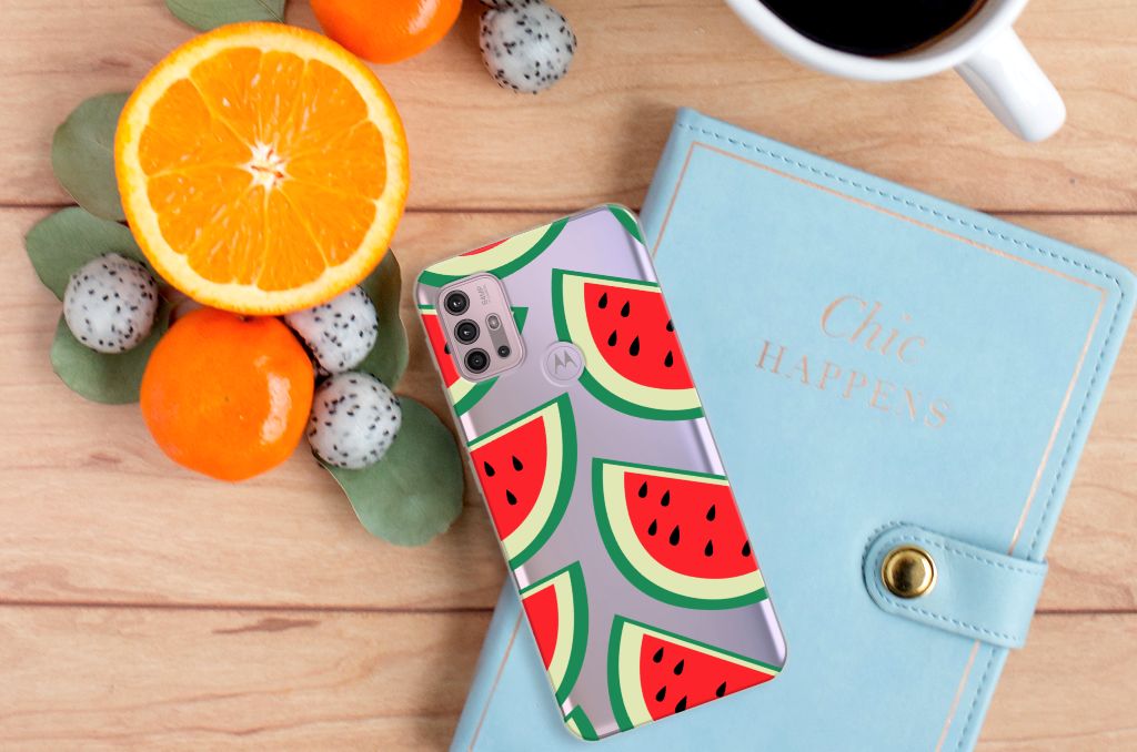 Watermeloenen zijn uitstekende dorstlessers, misschien dat je daarom juist in de zomermaanden extra enthousiast raakt van dit design hoesje Watermelons. Jij blijft gezond als je zo nu en dan een watermeloen neemt, jouw smartphone blijft in tact als je er deze Motorola Moto G30 | G10 Siliconen Case omheen doet. Deze tpu case wordt alleen aan de bovenkant bedrukt met watermeloenen is zeer flexibel. De randen van het hoesje blijven transparant. Je kunt ook kiezen voor andere soorten fruit op je hoesje. Kijk maar eens naar onze andere design hoesjes op onze website.