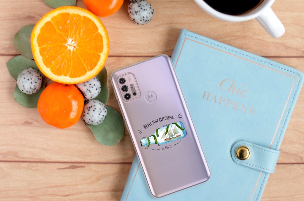 Dit leuke design met een schip in een fles is voor de echte avonturier of reiziger. Dankzij de tekst ‘Never stop exploring: Go for it’ word je altijd herinnerd aan het feit dat het volgende avontuur weer op de loer ligt! Dit design staat op een Telefoonhoesje met Naam voor je Motorola Moto G30 | G10. TPU is flexibel en heel erg sterk. Zo is je telefoon aan de achterkant en de randen heel goed beschermd. De case is aan de bovenkant bedrukt, de randen blijven transparant. Het TPU-hoesje is perfect te combineren met een screenprotector, zo zijn je telefoon en je beeldscherm altijd goed beschermd.