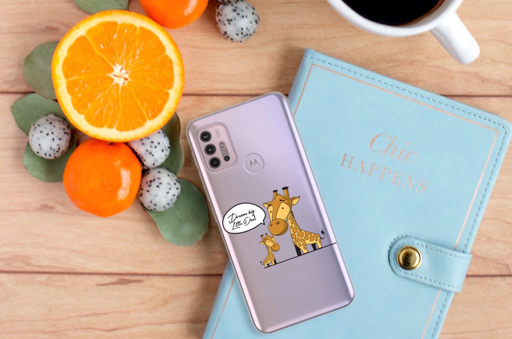 Ben je op zoek naar een uniek telefoonhoesje voor je Motorola Moto G30 | G10? Dan ben je bij B2C Telecom aan het juiste adres! Speciaal voor jou hebben we dit prachtige Giraffe design in onze collectie hoesjes opgenomen. Het design wordt bedrukt op een Telefoonhoesje met Naam en is gemaakt van flexibel rubber. Het design wordt alleen aan de bovenkant van het hoesje bedrukt en de randen blijven transparant. Aan de zijkanten zijn uitsparingen gemaakt waardoor je met gemak alle knoppen en poorten kunt bedienen. Wij adviseren om dit hoesje in combinatie met een screenprotector te gebruiken voor een langere levensduur van je telefoon. Wil je dit design hoesje nog iets extra's geven? Voeg dan gratis je naam of een quote toe! Is dit design hoesje toch niet helemaal wat je zocht? Ontwerp dan zelf een hoesje in ons ontwerpprogramma.