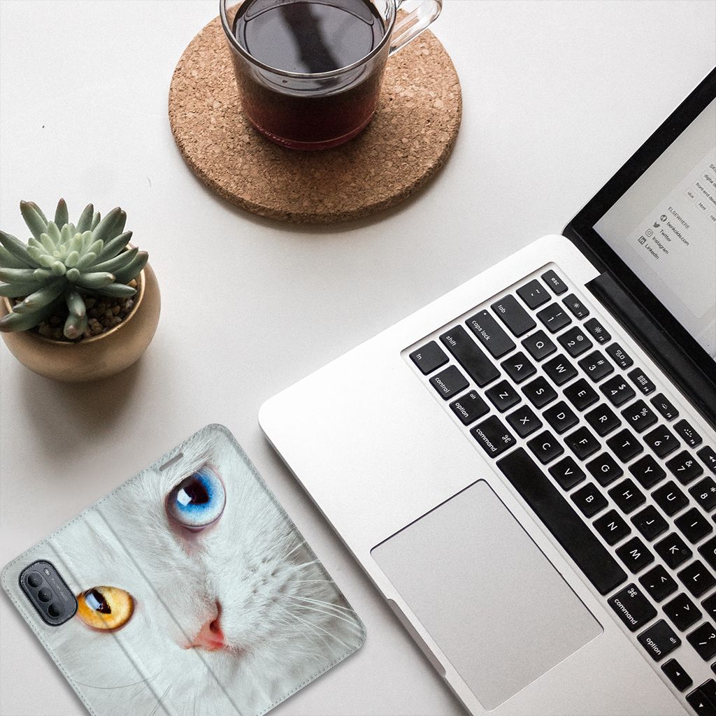 Witte katten zijn natuurlijk extra speciaal, vandaar we een exemplaar op een design hoesje hebben gezet. Een witte kat schijnt trouwens ook slechter te kunnen horen dan katten met een andere kleur. Deze witte kat staat op een zeer prominente wijze op een stand case. Deze stand case met witte kat ziet er geweldig uit en is voorzien van verschillende uitsparingen en een speciale standaard. Een Motorola Moto G31 | G41 Hoesje maken met witte kat beschermt jouw smartphone perfect. Alle zijden van de case zijn bedrukt. Jouw smartphone wordt erg duurzaam met dit design hoesje. Het TPU aan de binnenzijde is zeer flexibel en het pu-leer oogt chique. Verder heeft de case een houder voor bijvoorbeeld je rijbewijs aan de binnenkant.