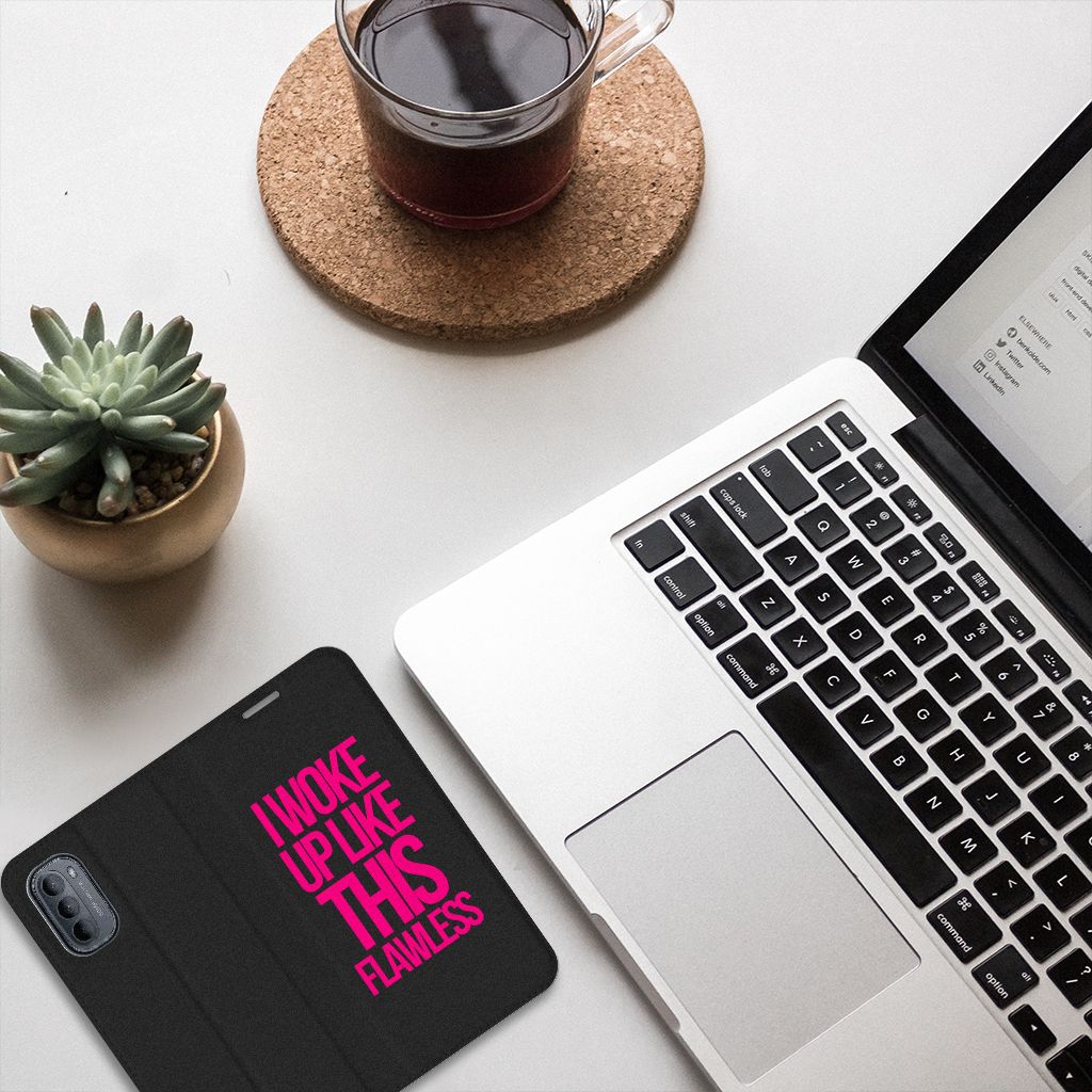 Met deze zwarte Motorola Moto G31 | G41 Hoesje met tekst met deze paarse tekst kun je met recht trots zijn. De case komt als geroepen voor jouw smartphone. Met dit zwarte design hoesje met Woke Up tekst heb je een zeer solide product in handen. Dit zeer populaire smartphone hoesje heeft 1 vakje en is aan alle zijden bedrukt. Verder heeft de case een standaard en een magneet aan de binnenkant. De houder is van TPU, de buitenzijde van PU-leer. We willen je er ook op wijzen dat je zelf een hoesje kunt ontwerpen, met eigen beelden en teksten. Met onze Phone Case Designer kun je zelfs opvallende effecten, patronen en clip arts aan het ontwerp toevoegen.