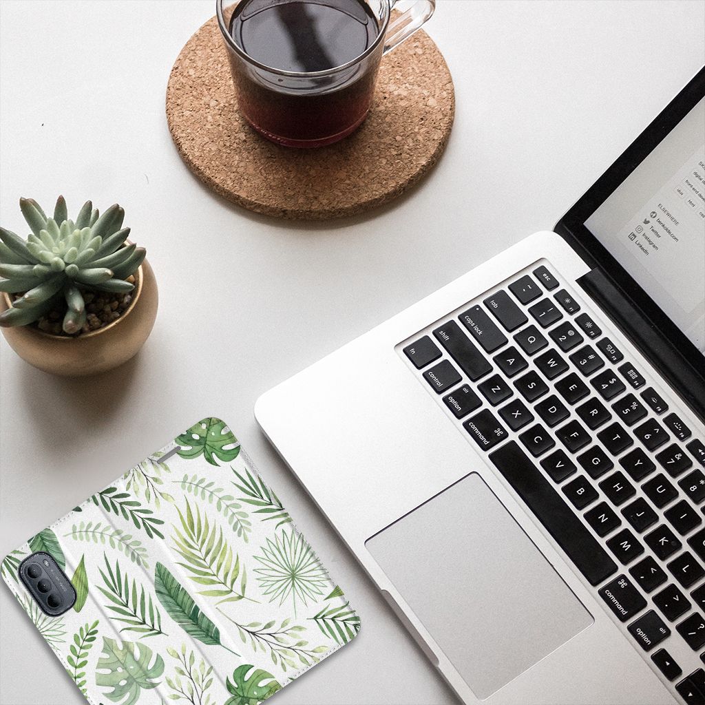 Je voelt je verbonden met de natuur als je kiest voor deze Motorola Moto G31 | G41 Smart Cover met print Leaves. De print bestaat uit verschillende groene bladeren en dit zorgt voor een fraai decoratief geheel. Met dit patroon van groene bladeren creëer je een frisse uitstraling voor jouw smartphone. Jij doet er verstandig aan om je telefoon te beschermen met dit design hoesje met groene bladeren, die staan op een stand case. Dit hoesje kenmerkt zich onder meer door het handige vakje aan de binnenzijde en de magnetische sluiting aan de binnenzijde. Voel jij jezelf gezond met een beeld van groene bladeren, dan is deze stand case met print een uitstekende optie. Het beschermt jouw telefoon aan alle zijden. Het TPU aan de binnenzijde klemt zich perfect om jouw smartphone. Kijk ook eens naar onze andere hoesjes met bladeren of misschien maak je zelf wel gewoon liefst je eigen hoesje met eigen foto’s van bladeren.