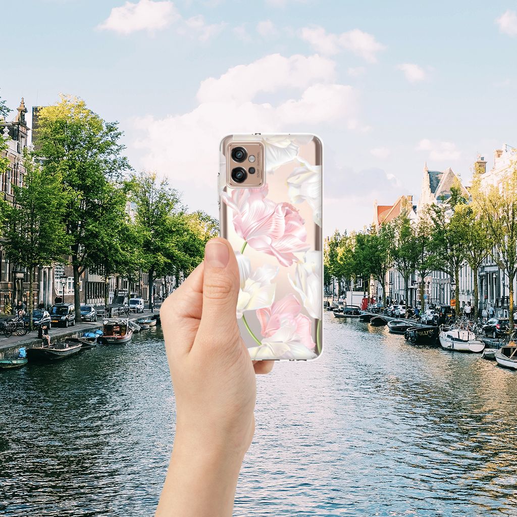 Een bosje bloemen doet een mens (en zijn smartphone) goed. De witte en roze bloemen op deze Motorola Moto G32 TPU Case geven jouw smartphone een zeer mooie uitstraling. Je wordt er ook meteen een stuk rustiger van als je aan het appen of aan het bellen bent. Valt dan je telefoon op de grond, dan zal er dankzij de tpu case met het design Lovely Flowers ontstaan. Helemaal niet als je er een screenprotector bij hebt gekocht. Onze tpu cases met roze en witte bloemen zien er zeer prettig uit en zijn heel praktisch, getuige onder meer de opstaande randen en het flexibele materiaal. Alleen de achterkant van de tpu case wordt bedrukt met roze en witte bloemen. Op deze tpu case kun je trouwens ook een eigen ontwerp zetten. In een paar simpele stappen ontwerp je zelf een stand case met daarop jouw favoriete bloemen.