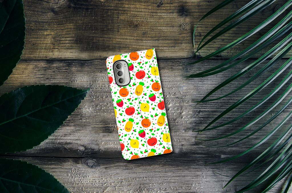 Een fris, fruitig en vrolijk hoesje, deze case met afbeeldingen van aardbeien, ananassen, appels, sinaasappels en citroenen. Minstens twee stuks fruit per dag wordt aanbevolen als dagelijkse hoeveelheid voor de mens. Dit verkleint de kans op allerlei ziekten. Dus met het aantal stukken fruit op de Motorola Moto G51 5G Flip Style Cover zou je wel een maandje zoet moeten zijn. Met het hoesje zelf kun je je hele leven doen, dit is namelijk niet stuk te krijgen. Dit komt door het sterke en flexibele materiaal waarvan het gemaakt is. De vrolijk stemmende case het desing Fruits maakt jouw telefoon dus zeer duurzaam. Zorg ervoor dat jouw smartphone gezond blijft en kies voor dit hoesje met frivool fruit. Een stand case met fruit beschermt jouw telefoon aan alle kanten en beschikt over een 1 opbergvakje en een speciale standaard. Het hoesje met fruit wordt afgesloten met een magneet aan de binnenzijde. De houder aan de binnenzijde is van TPU.