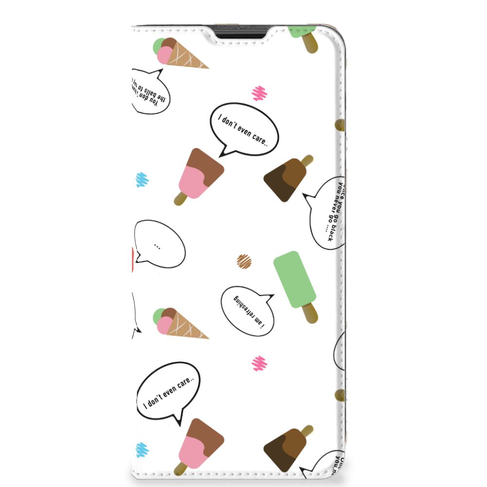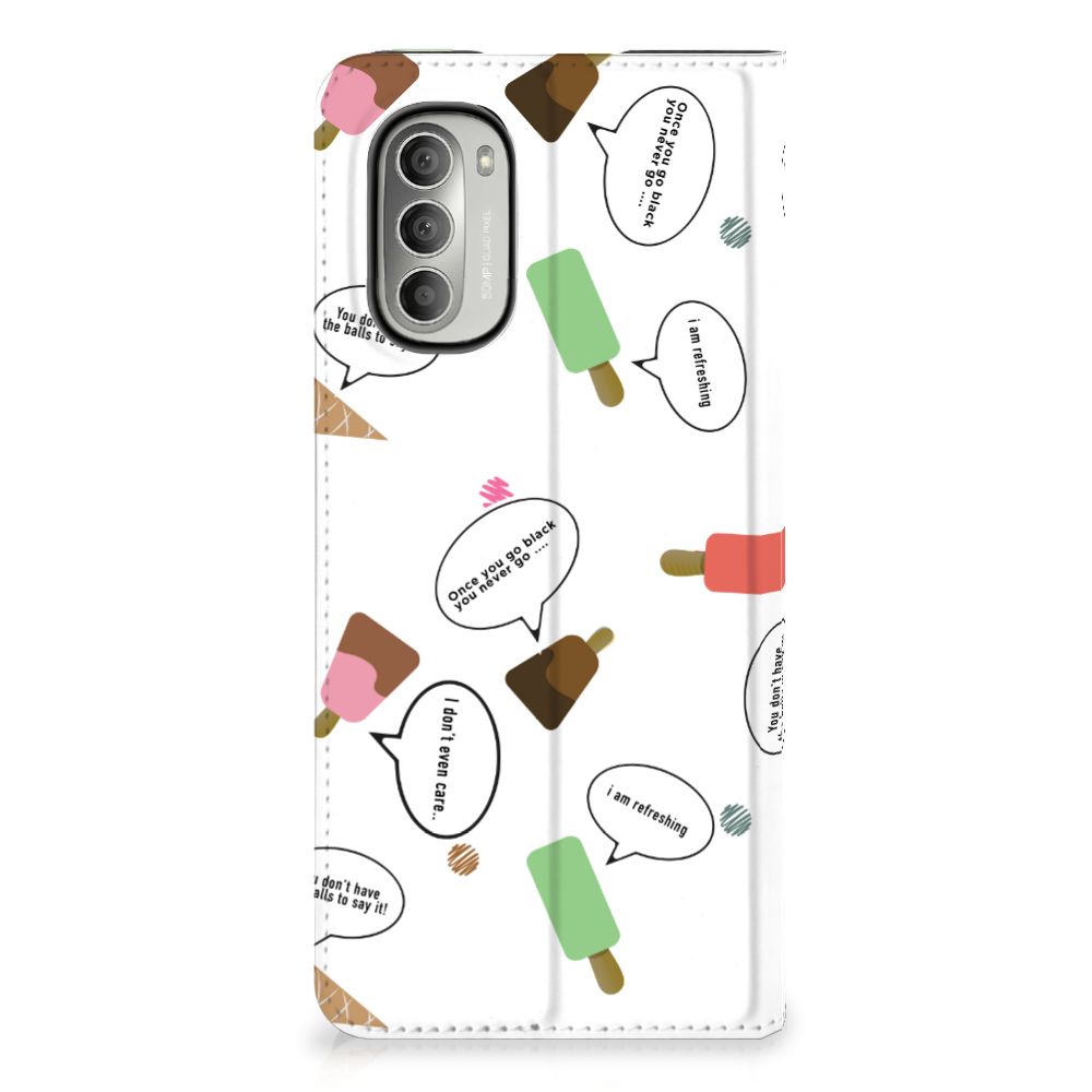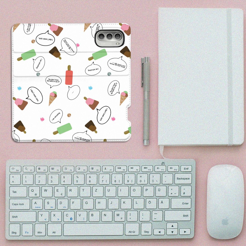 Van deze vrolijke Motorola Moto G51 5G Flip Style Cover met daarop verschillende soorten ijsjes met tekstwolkjes krijg je sowieso een vrij en zomers gevoel. De zomer komt naar je toe met deze print van ijsjes met tekstwolkjes. Ben je op het strand, dan ontbreekt een lekker ijsje natuurlijk niet. Net zoals je je smartphone bij de hand hebt, met daaromheen een design hoesje met bijzondere ijsjes en tekstwolkjes. Jouw telefoon kan dan de bescherming in de vorm van een stand case met ijsjes zeer goed gebruiken. Alle zijden van dit hoesje worden bedrukt met ijsjes en dankzij de speciale standaard is het erg prettig om filmpjes te bekijken. De case wordt aan de binnenzijde met een magneet afgesloten en de houder aan de binnenzijde is van TPU. Onder alle weersomstandigheden zal deze case met 1 opbergvakje en ijsjes perfect functioneren, ook op het strand met een ijsje in je hand.