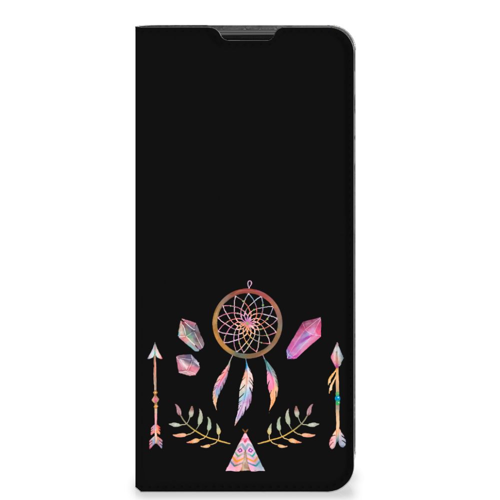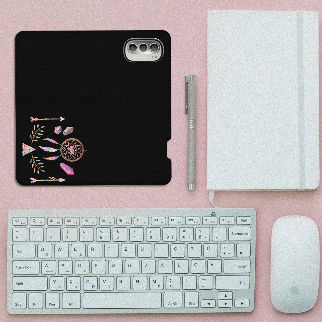 Een dromenvanger werd lang geleden al door een indianenvolk in Noord-Amerika gebruikt om nare dromen te weren. Nu nog hangen mensen over de hele wereld dromenvangers boven hun bed. Maar ook op een telefoonhoesje staat zo’n boho dreamcatcher heel mooi. Dit mooie design dat bestaat uit een tipi, pijlen en dromenvanger heeft veel verschillende prachtige kleuren. Maar omdat het ontwerp minimalistisch en klein is, is het design toch subtiel te noemen. Dit ontwerp staat op een Magnet Case voor je Motorola Moto G51 5G. Dit populaire smartphonehoesje heeft één vakje voor een pasje of briefgeld en is aan alle zijden bedrukt. Met de standcase zet je je telefoon gemakkelijk neer, zodat je je handen vrij hebt als je bijvoorbeeld een video wilt kijken. De binnenkant van de standcase is van grijs PU-leer. Dat is fijn, omdat je daardoor niet snel vlekken ziet op je hoesje.