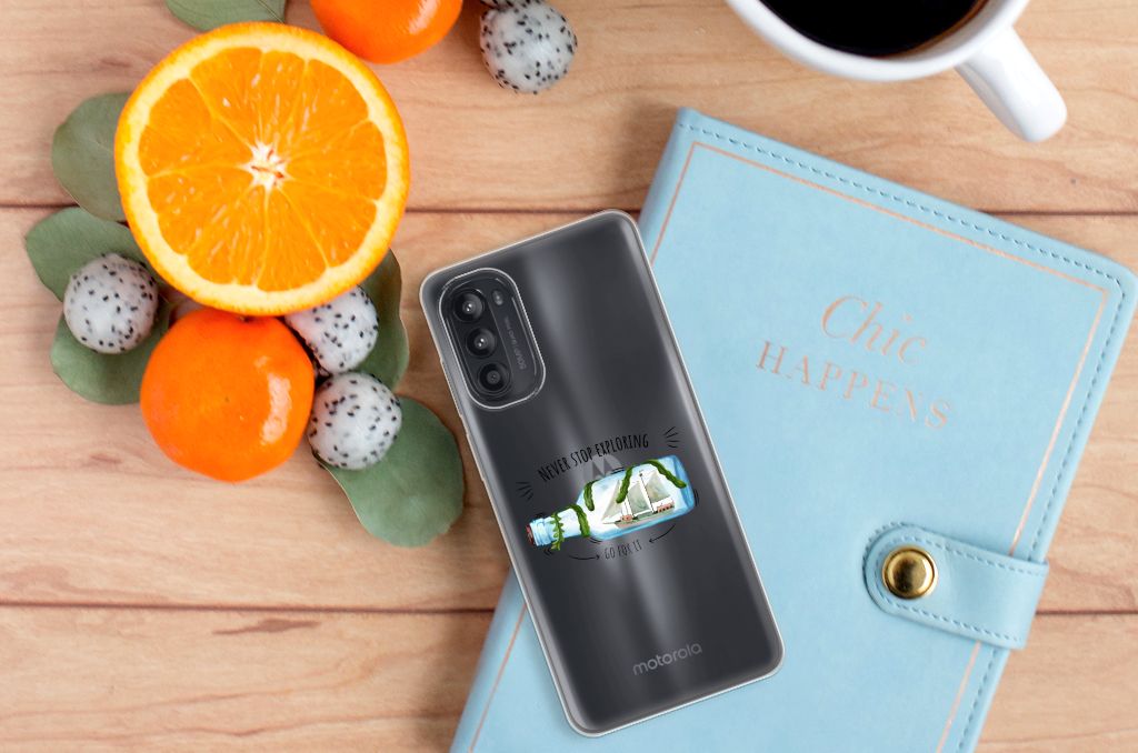 Dit leuke design met een schip in een fles is voor de echte avonturier of reiziger. Dankzij de tekst ‘Never stop exploring: Go for it’ word je altijd herinnerd aan het feit dat het volgende avontuur weer op de loer ligt! Dit design staat op een Telefoonhoesje met Naam voor je Motorola Moto G52/G82. TPU is flexibel en heel erg sterk. Zo is je telefoon aan de achterkant en de randen heel goed beschermd. De case is aan de bovenkant bedrukt, de randen blijven transparant. Het TPU-hoesje is perfect te combineren met een screenprotector, zo zijn je telefoon en je beeldscherm altijd goed beschermd.