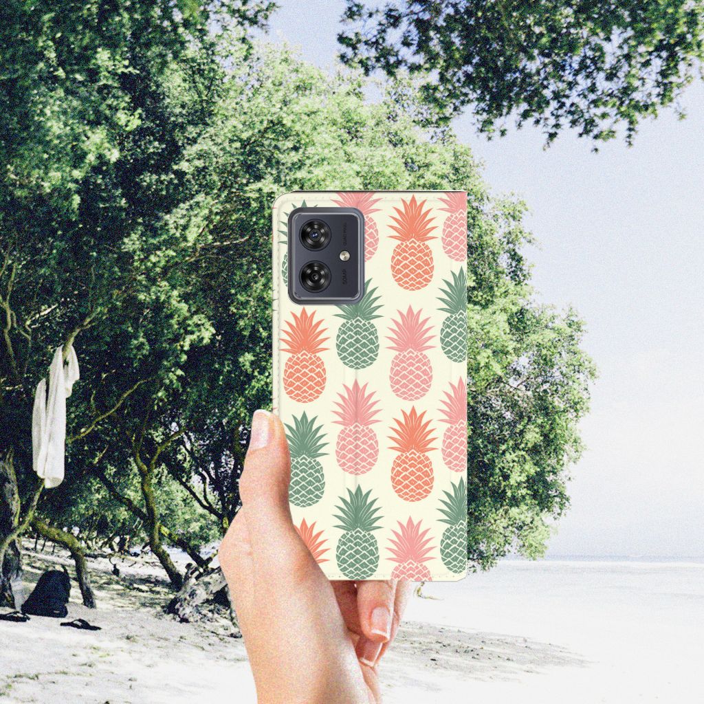 Ananas is een woord uit het Tupi, de taal van de Tupi-indianen, en betekent uitmuntende vrucht. Dit fruit van zeer hoge kwaliteit staat op onze superieure boekhoesjes, stand cases, hard cases en TPU cases. Jij blijft er gezond uitzien als je zo nu en dan een hap neemt van een Ananas , jouw smartphone blijft tip top in orde als je er een leuk telefoonhoesje omheen doet. Een ananas heeft stevig, veerkrachtig vruchtvlees. Een beetje te vergelijken met het TPU in onze hoesjes. TPU is elastisch materiaal, dat zeer buigzaam is. Vandaar dat het zeer schokbestendig is. Het ananas design staat op een stand case. Deze Motorola Moto G54 Flip Style Cover beschermt jouw telefoon aan alle kanten en beschikt over een 1 opbergvakje en een speciale standaard. Het hoesje wordt afgesloten met een magneet aan de binnenzijde. De houder aan de binnenzijde is van TPU.