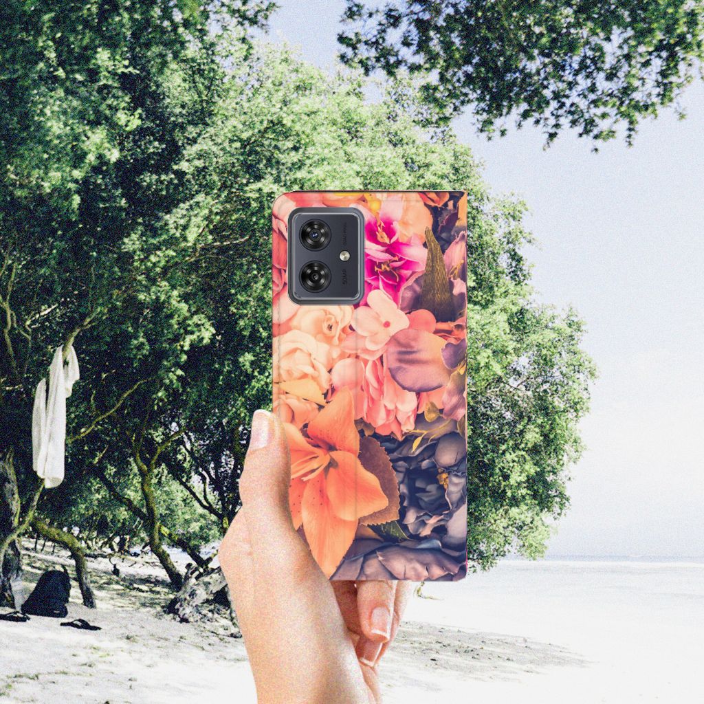 Dit Bosje Bloemen doet een mens en zijn smartphone goed. De oranje, paarse en roze bloemen op deze Motorola Moto G54 Smart Cover geven jouw smartphone een zeer sierlijke uitstraling. Je wordt er ook meteen vrolijker van als je aan het appen, mailen of aan het bellen bent. Valt dan je telefoon op de grond, dan zal er dankzij de stand case met oranje, paarse en roze bloemen geen schade ontstaan. Onze stand cases met oranje, paarse en roze bloemen bieden de allerbeste bescherming en zijn heel praktisch, wat blijkt uit onder meer het vakje aan de binnenkant en de handige standaard waarmee je de smartphone rechtop op tafel neer kunt zetten. De oranje, paarse en roze bloemen passen goed op alle zijden van de case. Op deze stand case van leer en TPU (houder aan de binnenkant) is het ook mogelijk je eigen ontwerp te zetten. In no time maak je zelf een stand case met daarop foto’s van jouw favoriete bloemen.