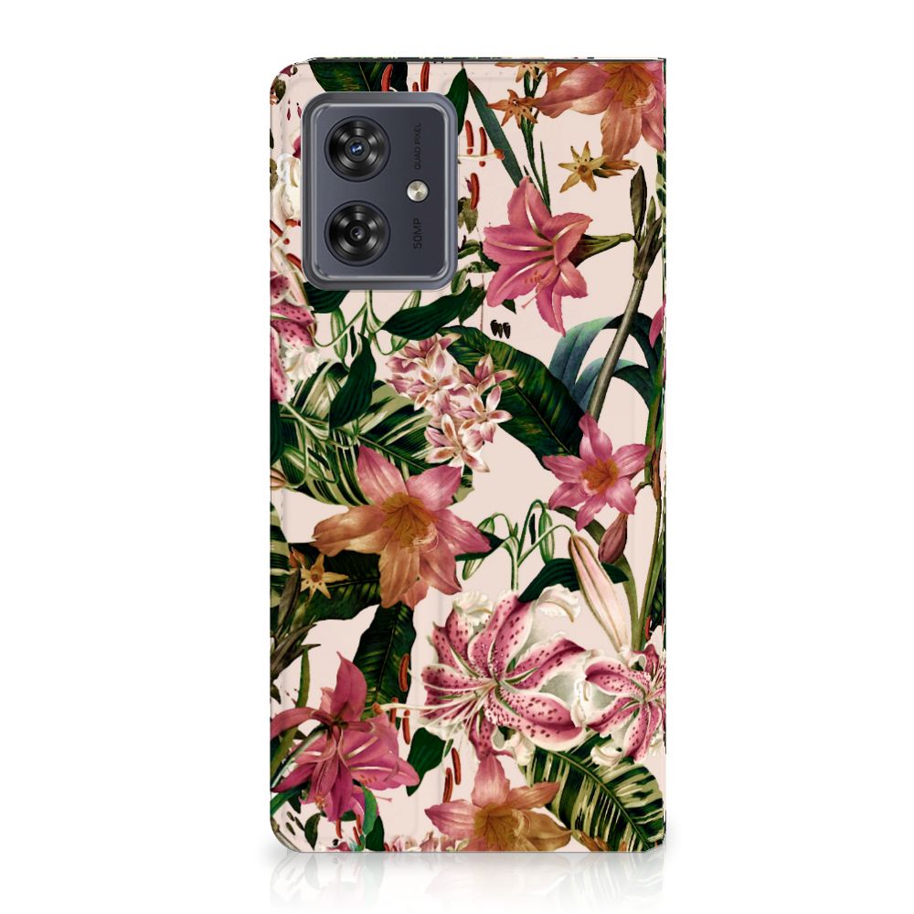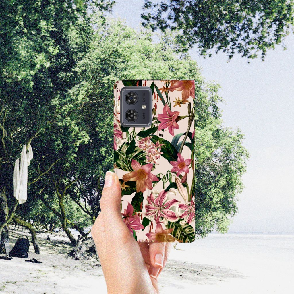 Dit Flowers design is een zegen voor de mens en zijn smartphone. De paarswitte bloemen en groene bladeren op deze Motorola Moto G54 Smart Cover geven jouw smartphone een zeer sierlijke uitstraling. Je krijgt er meteen een goed gevoel bij als je aan het appen, mailen of aan het bellen bent. Valt dan je telefoon op de grond, dan zal er dankzij de stand case met paarswitte bloemen en groene bladeren geen schade ontstaan. Onze stand cases met paarswitte bloemen en groene bladeren bieden de allerbeste bescherming en zijn heel praktisch, wat blijkt uit onder meer het vakje aan de binnenkant en de handige standaard waarmee je de smartphone rechtop op tafel neer kunt zetten. De paarswitte bloemen en groene bladeren komen op alle zijden van de case te staan. Op deze stand case van leer en TPU (houder aan de binnenkant) kun je in no time zelf foto’s van jouw favoriete bloemen zetten.