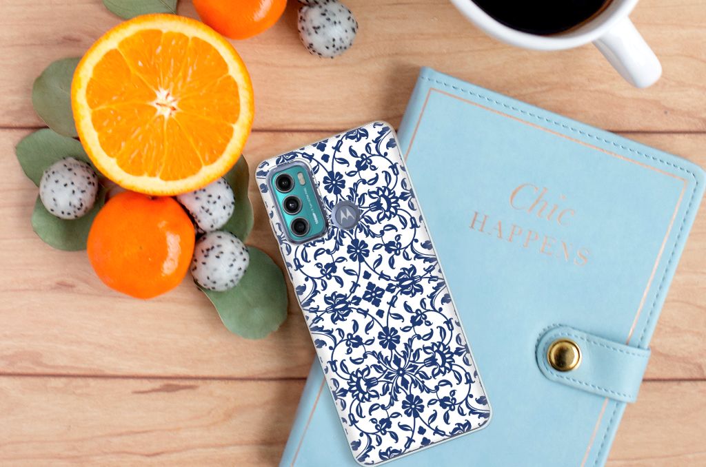 Een plaatje, deze Motorola Moto G60 TPU Case met Flower Blue patroon, die jouw telefoon van een hele mooie uitstraling voorziet. We hebben verschillende soorten patronen in de aanbieding waarmee we jouw hoesje kunnen verrijken, maar dit is wel een van de fraaiste. Maar natuurlijk heeft iedereen zo zijn eigen smaak. Vandaar dat we nog allerlei andere patronen kunnen aanbieden in de leukste kleurencombinaties. Het tpu hoesje met blauwwit patroon beschermt jouw telefoon vooral aan de achterkant en zijkanten en heeft opstaande randen aan de voorkant. De tpu case is zeer flexibel dankzij het elastische materiaal. Wij bedrukken de case in eigen beheer. De zijkanten van de tpu case blijven transparant en krijgen dus geen blauwwit patroon. Alleen de achterzijde van de hoes wordt bedrukt. Heb je een rijke fantasie? Ontwerp dan je eigen design hoesje met favoriet patroon.