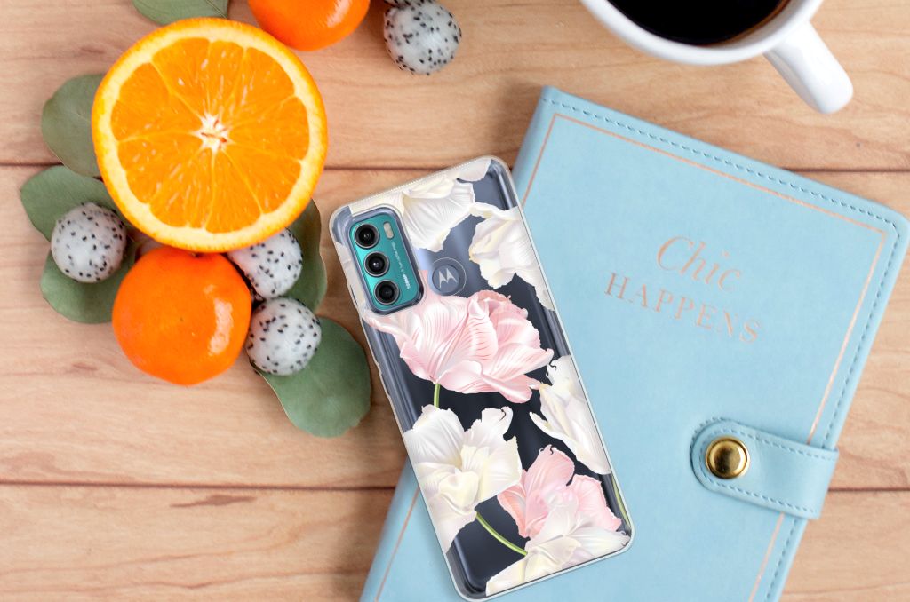Een bosje bloemen doet een mens (en zijn smartphone) goed. De witte en roze bloemen op deze Motorola Moto G60 TPU Case geven jouw smartphone een zeer mooie uitstraling. Je wordt er ook meteen een stuk rustiger van als je aan het appen of aan het bellen bent. Valt dan je telefoon op de grond, dan zal er dankzij de tpu case met het design Lovely Flowers ontstaan. Helemaal niet als je er een screenprotector bij hebt gekocht. Onze tpu cases met roze en witte bloemen zien er zeer prettig uit en zijn heel praktisch, getuige onder meer de opstaande randen en het flexibele materiaal. Alleen de achterkant van de tpu case wordt bedrukt met roze en witte bloemen. Op deze tpu case kun je trouwens ook een eigen ontwerp zetten. In een paar simpele stappen ontwerp je zelf een stand case met daarop jouw favoriete bloemen.